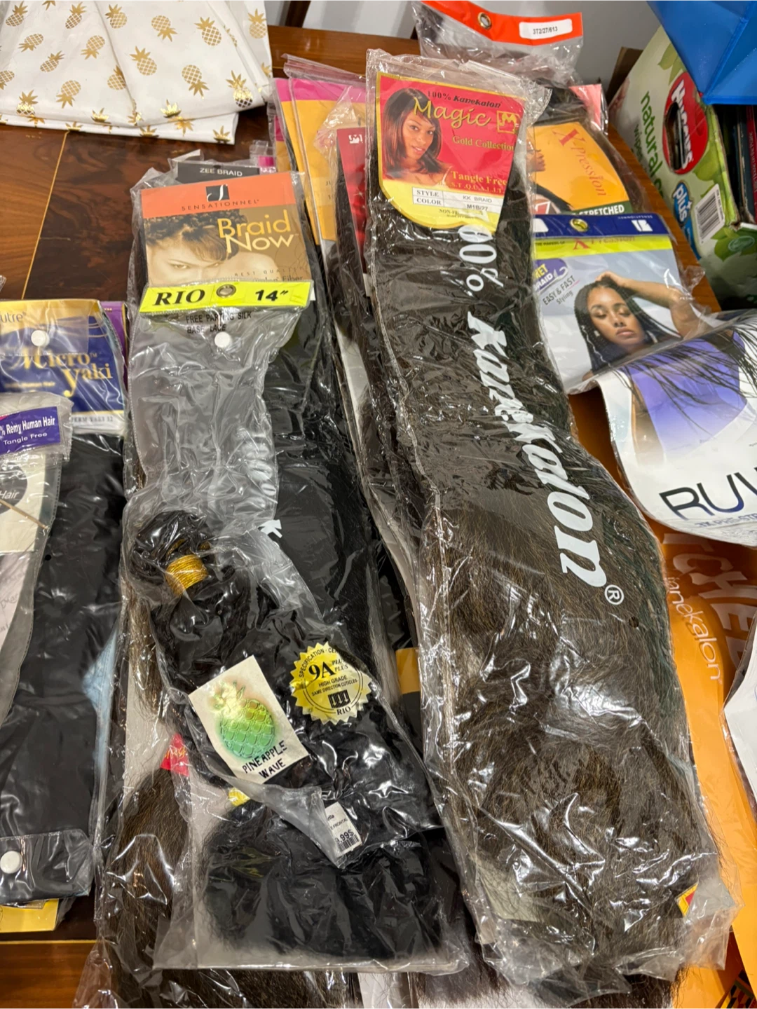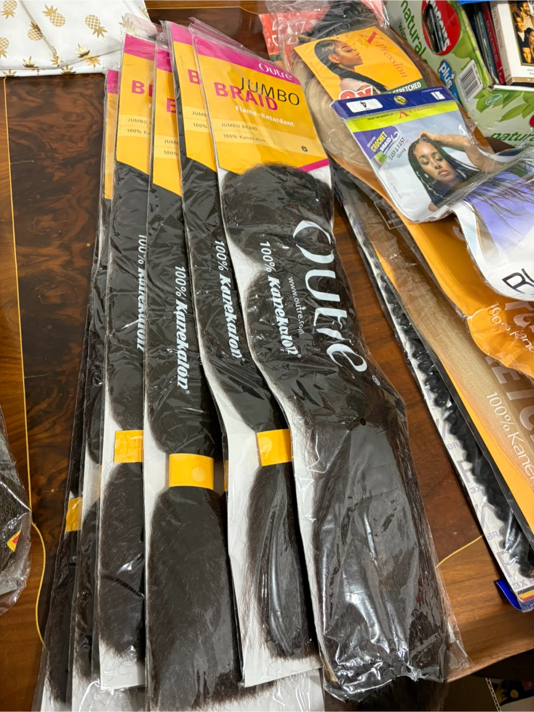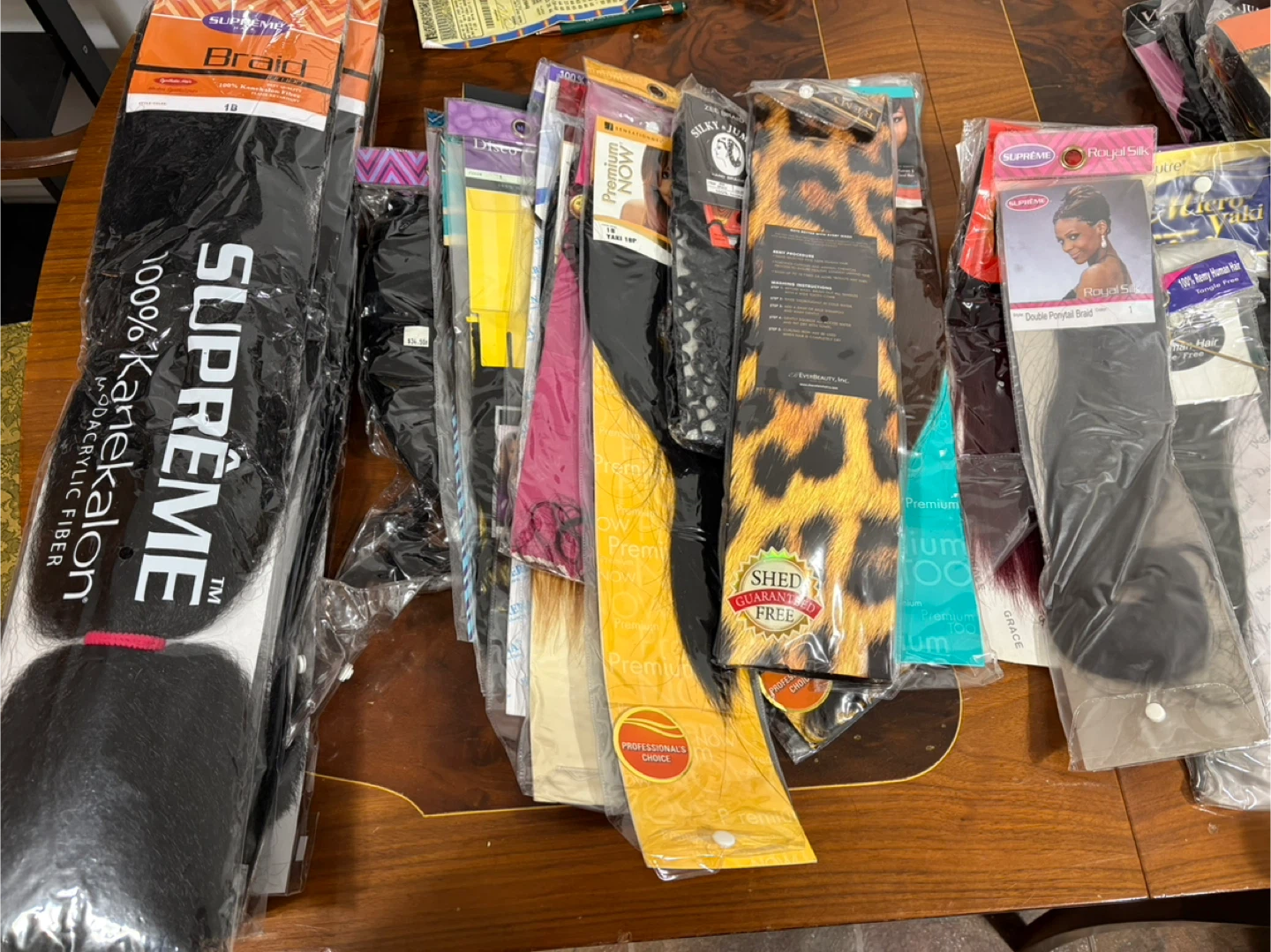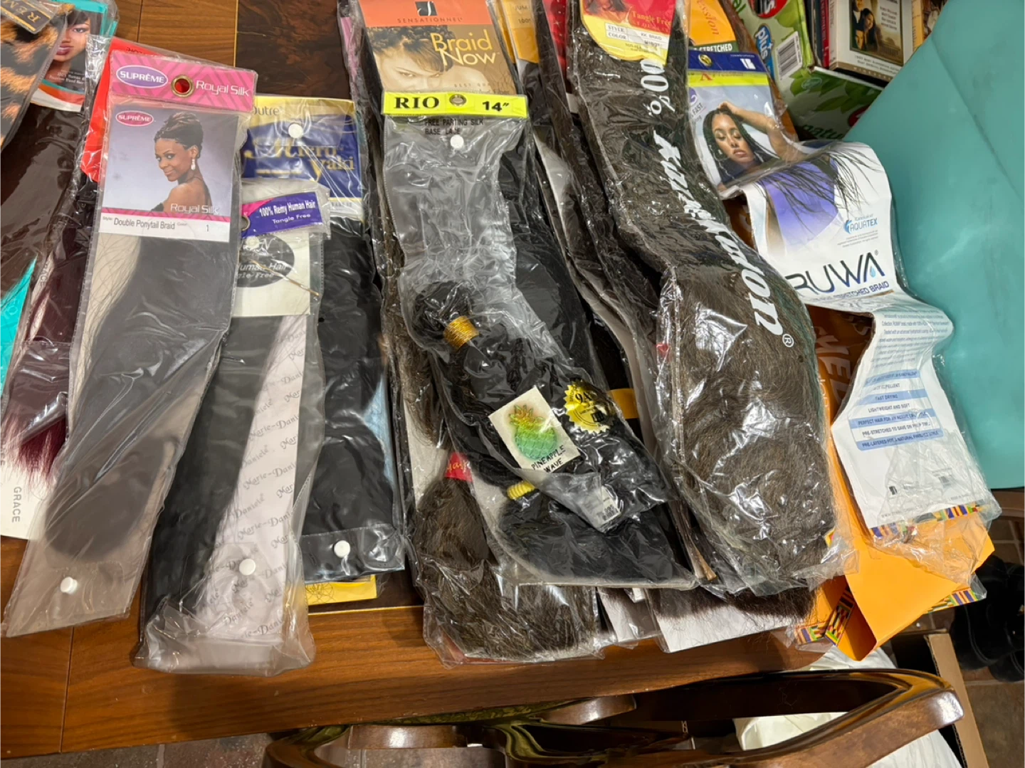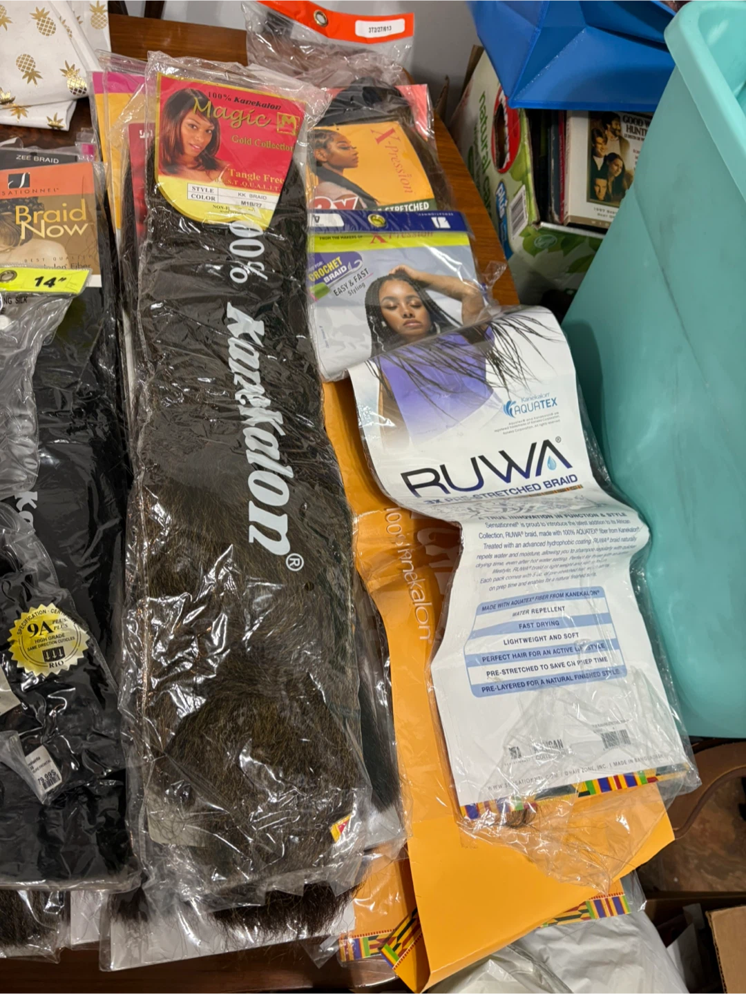 A collection of various braiding hair packs and extensions. Includes brands like Supreme, Ruwa, and Kankalon. Textures and colours vary.