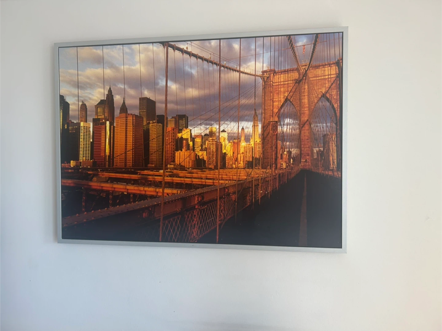 This framed print features the iconic Brooklyn Bridge with the New York City skyline in the background. The image captures the warm glow of sunset over the city. Framed with a silver-toned border.