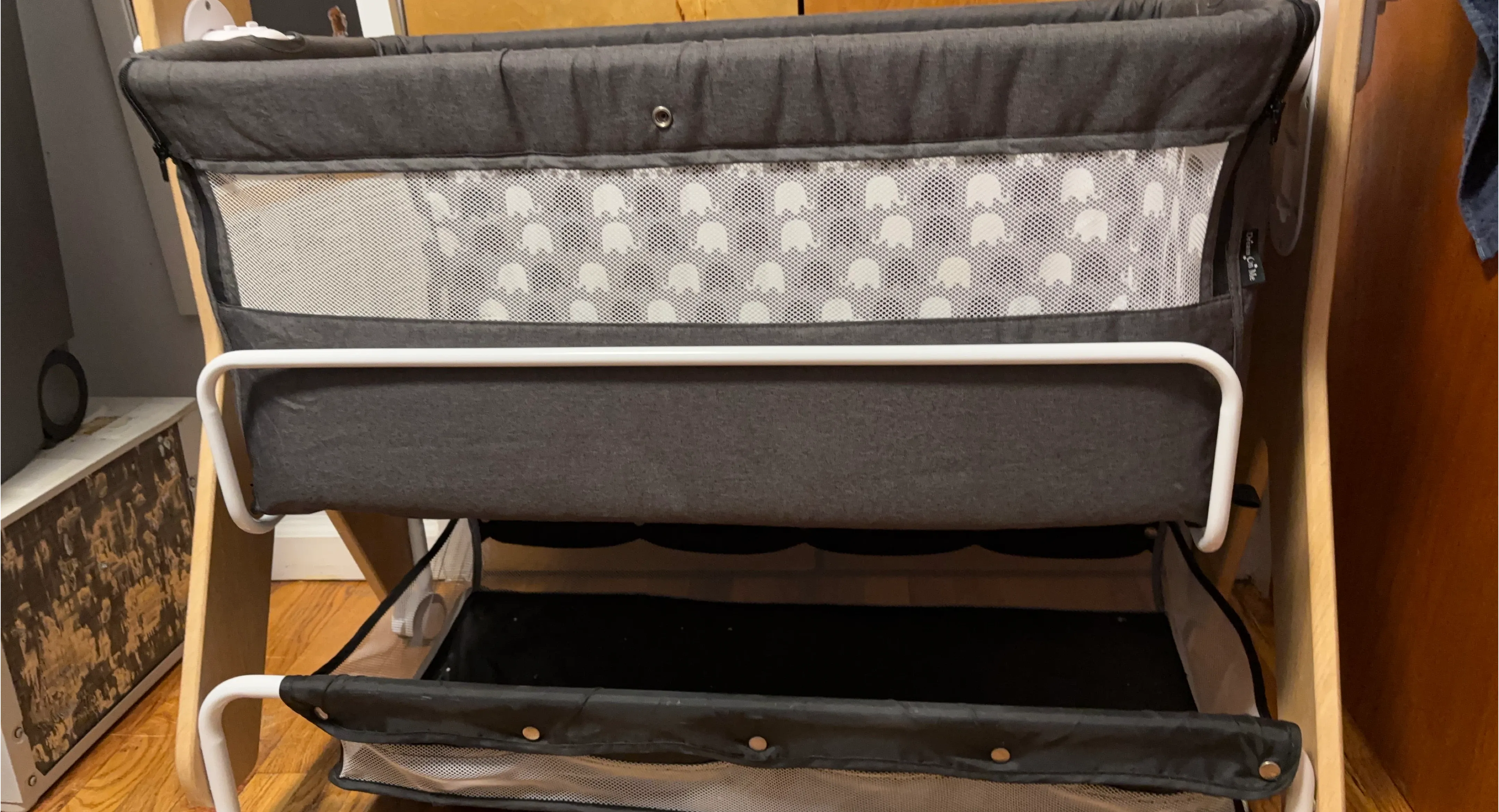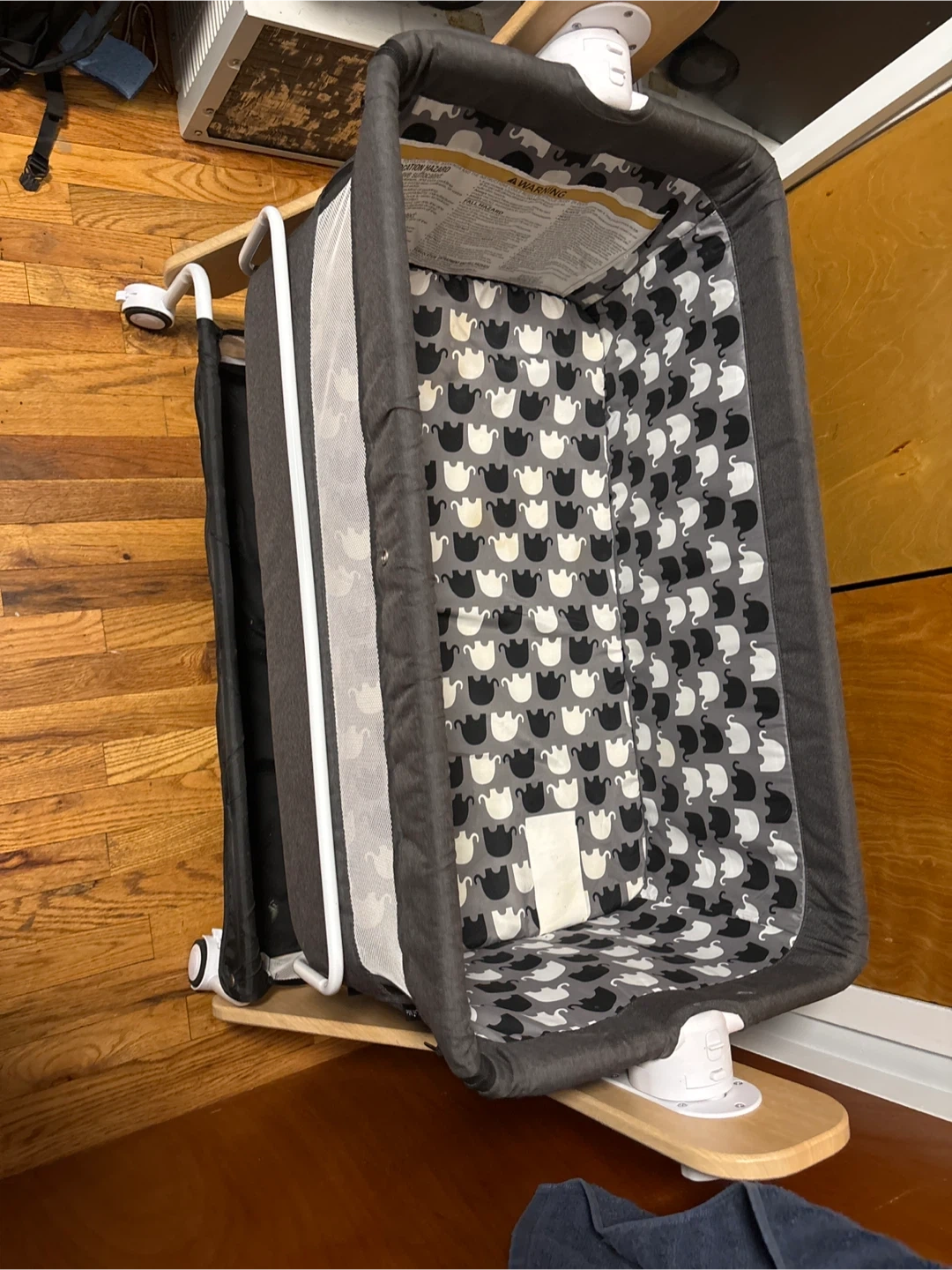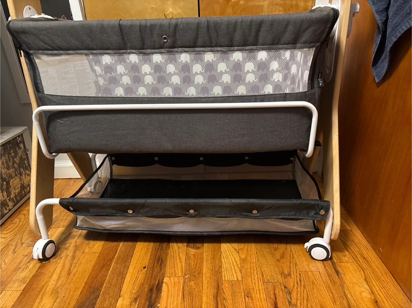 This portable bassinet is perfect for keeping your little one close. It features a gray exterior with a cute elephant pattern on the interior lining. Mesh sides allow for good ventilation and easy visibility. It's equipped with wheels for easy maneuverability around your home. Great for newborns and infants!