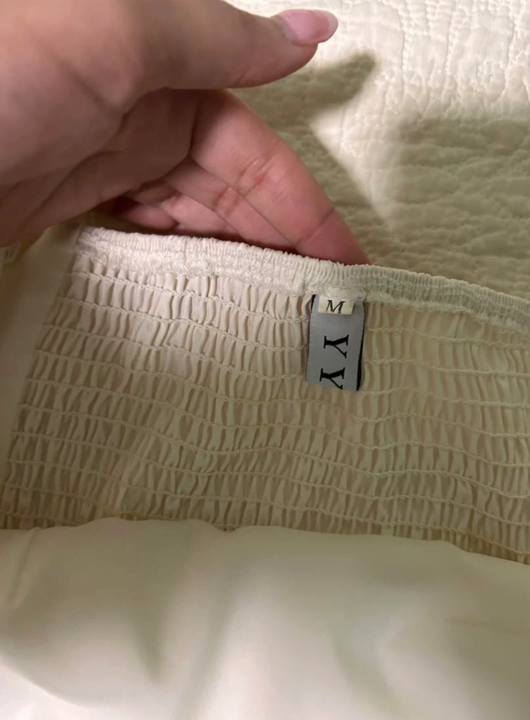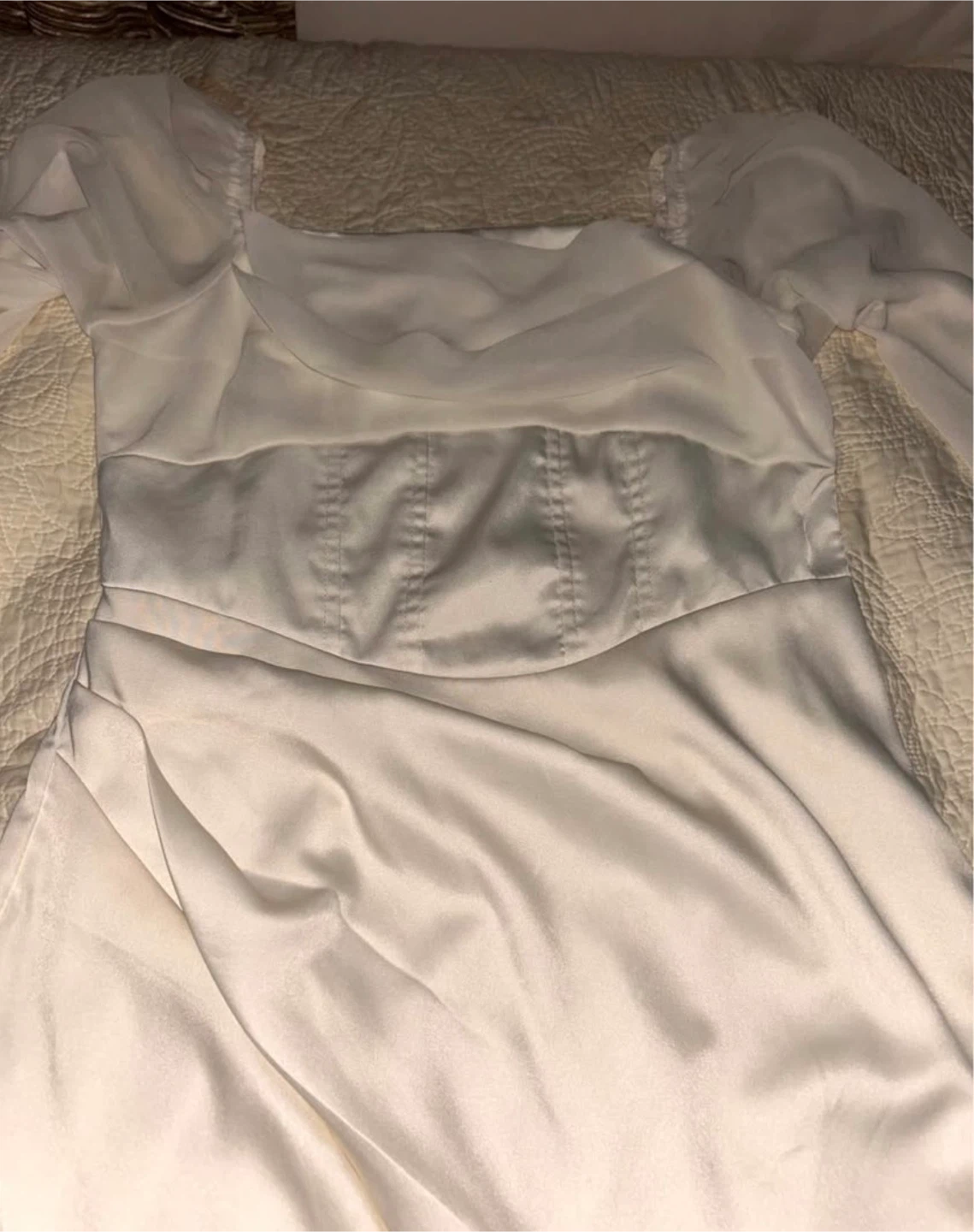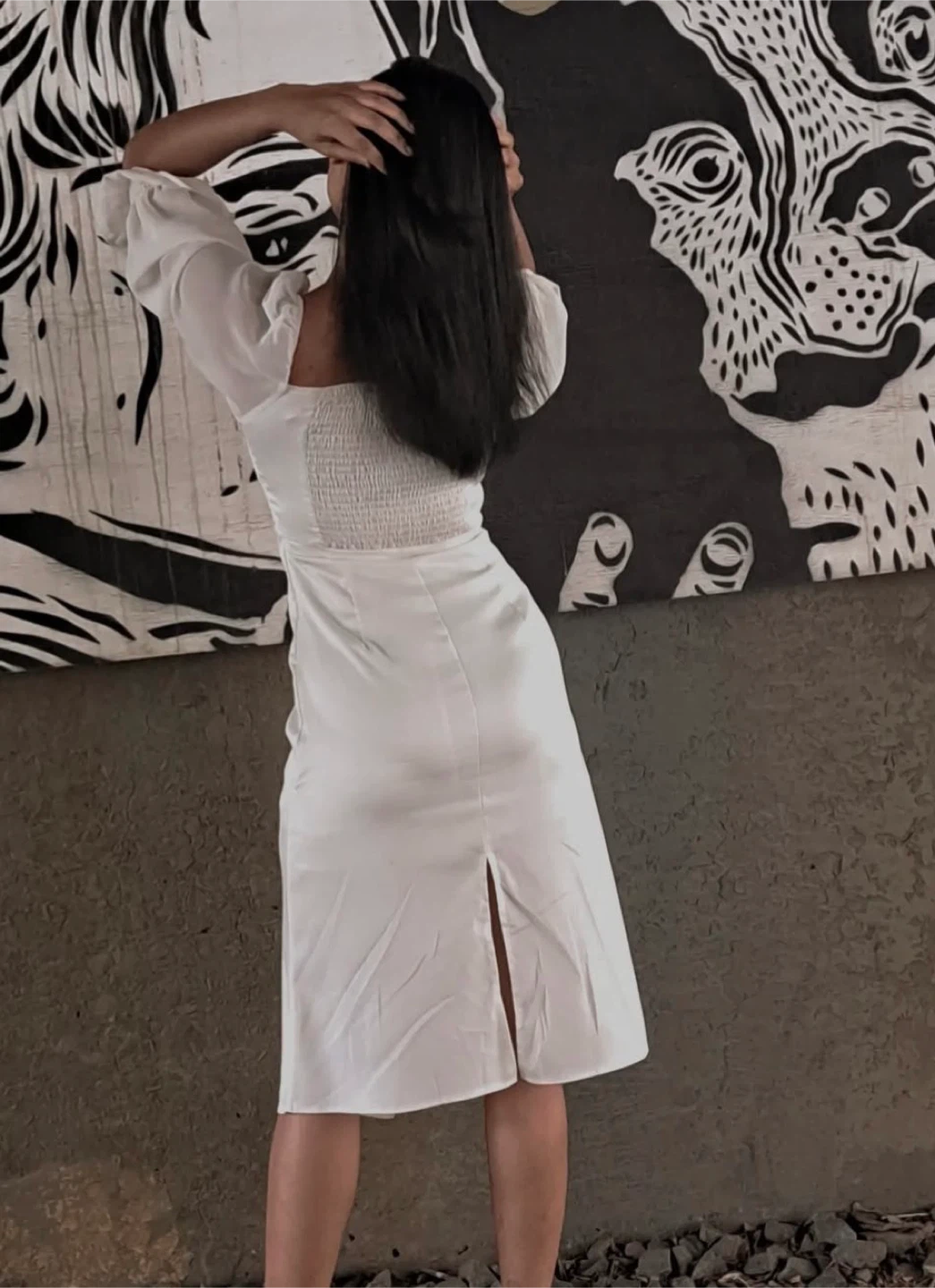 This white midi dress features a smocked bust and square neckline. It has a satin-like finish and a subtle slit in the back. Size M but run Small