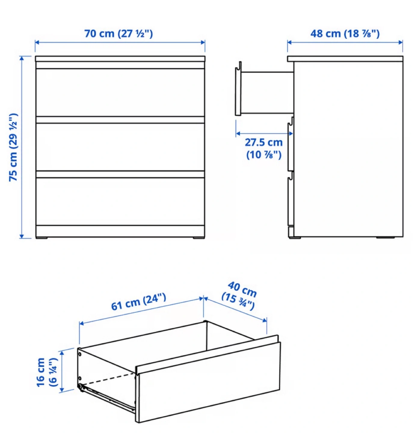 Brand new still in the box. Ordered the wrong colour. STORKLINTA 3-drawer nightstand, white/anchor/unlock-function. 27.5W x19Dx 29.5H (inches)