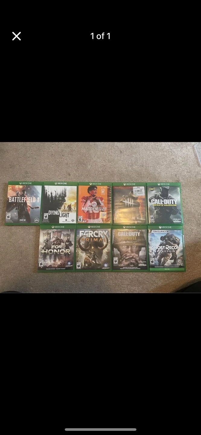 37$10 each. Ten pre-owned Xbox One games. Titles include Battlefield 1, Dying Light, Madden 20, Call of Duty: Infinite Warfare, For Honor, Far Cry Primal, Call of Duty WWII, and Tom Clancy's Ghost Recon Breakpoint. Great bundle for any gamer.