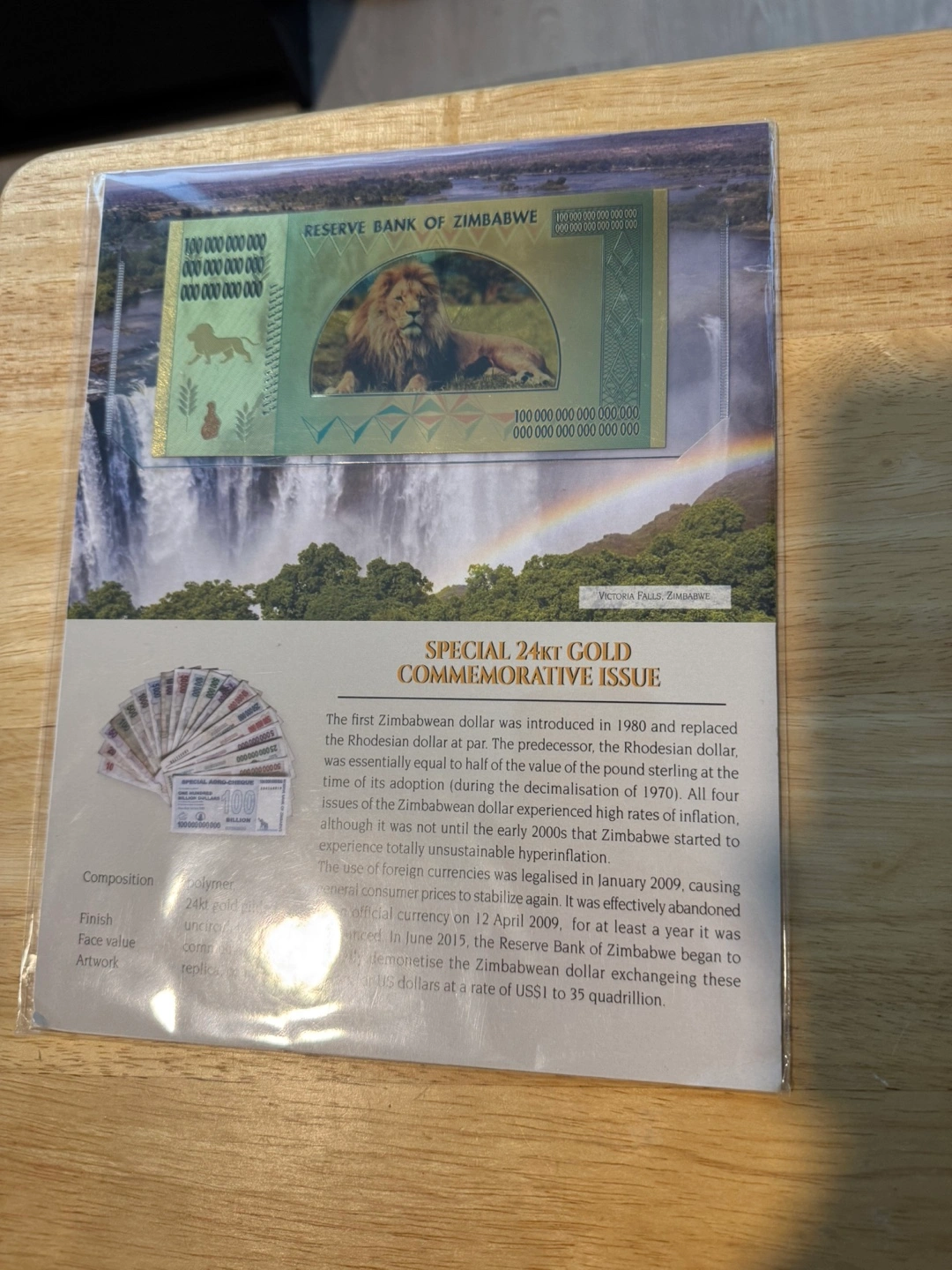 Special 24k gold commemorative issue. Reserve Bank of Zimbabwe. Includes information card. $20 Chase River Area
