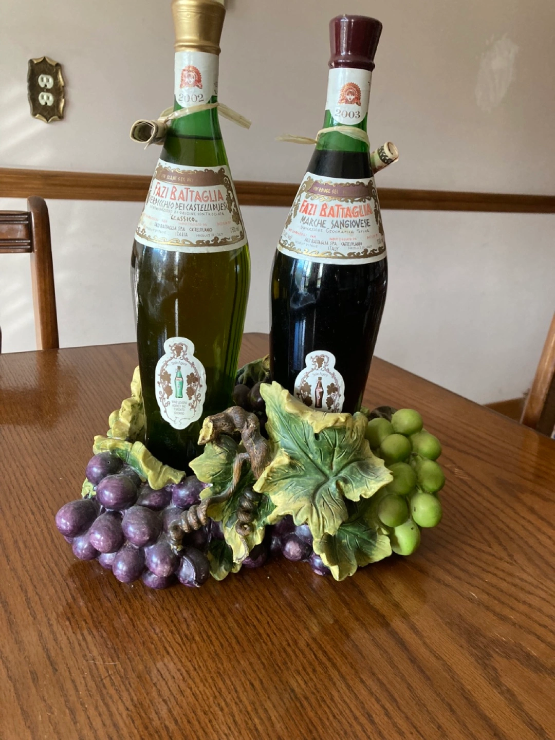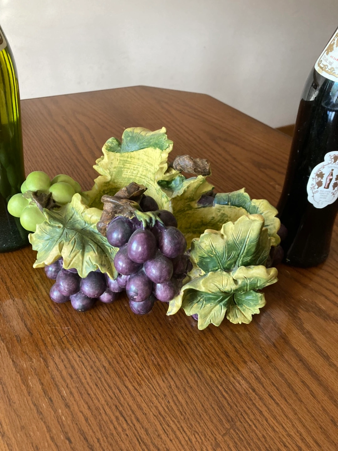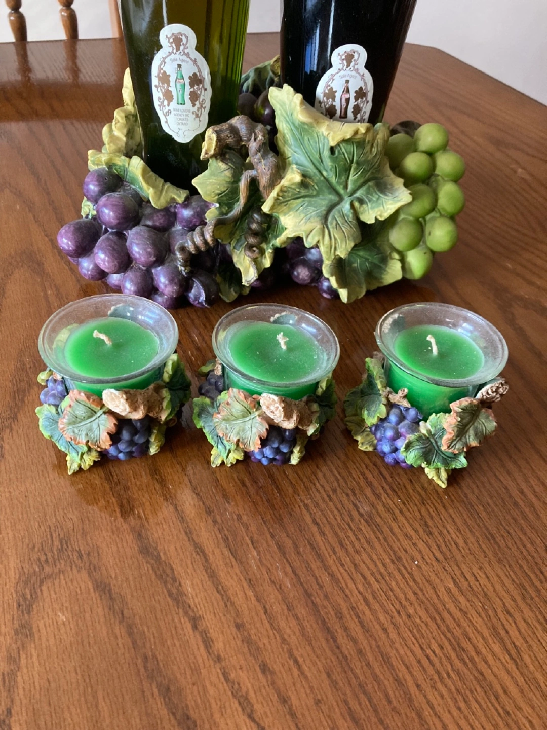 Adorable grape-themed wine bottle holder. Holds two bottles. Includes three small grape-themed candle holders with green candles. Perfect for wine lovers.