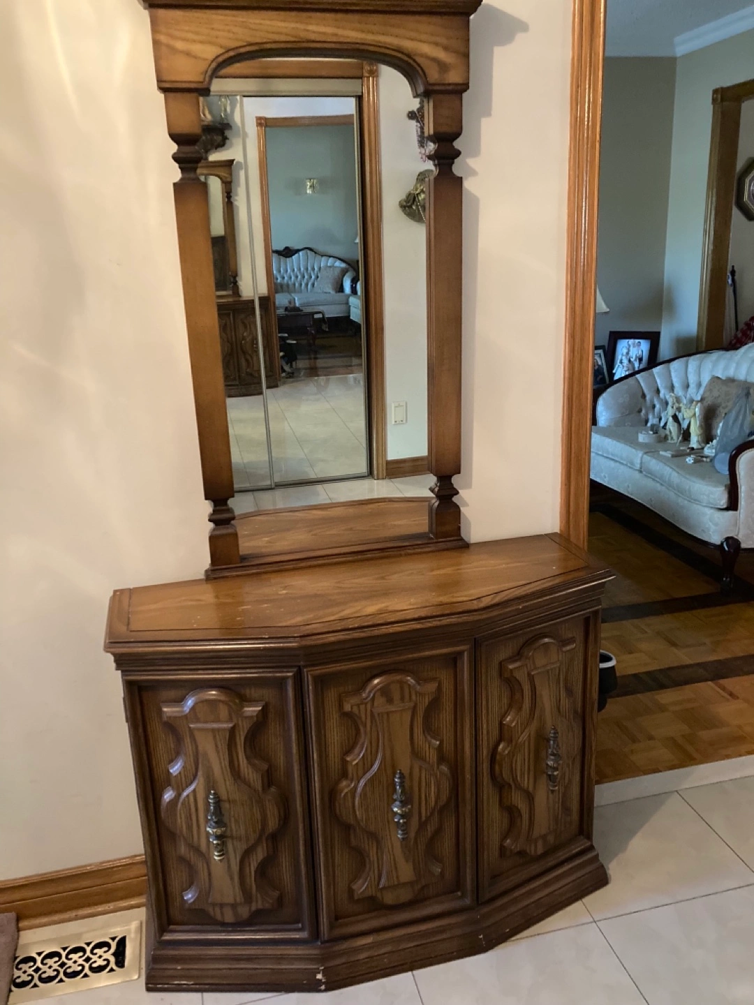 Dark brown wood vanity with a mirror. Three storage cabinets. Intricate carvings on cabinet doors. Great for a bedroom or entryway.