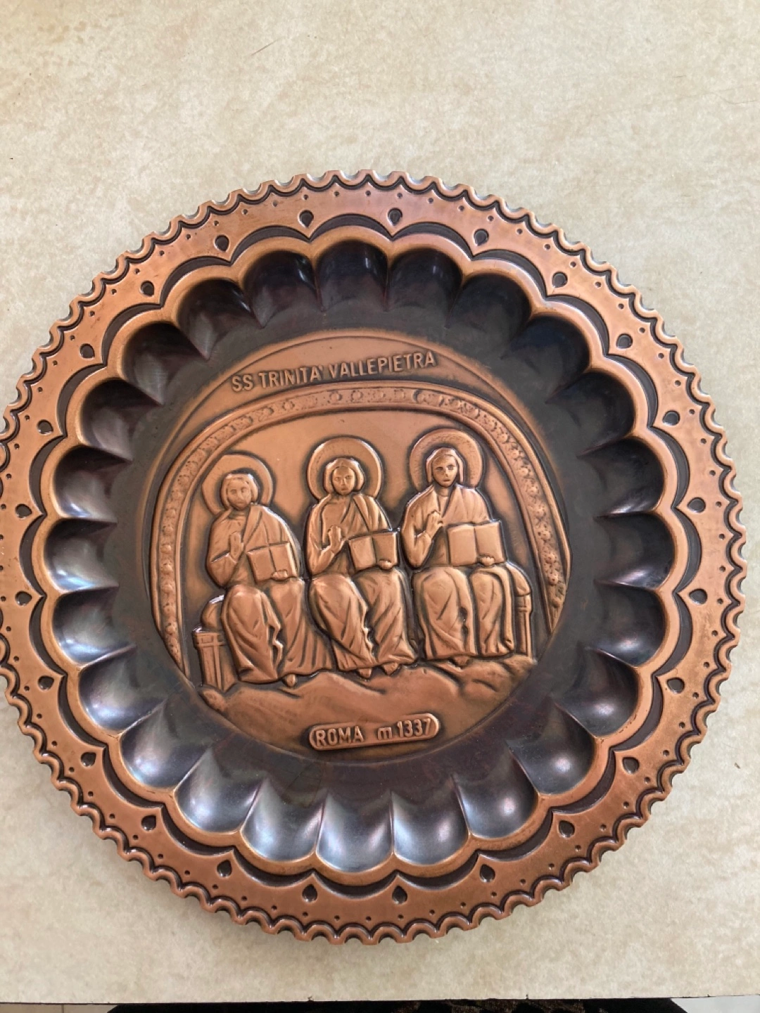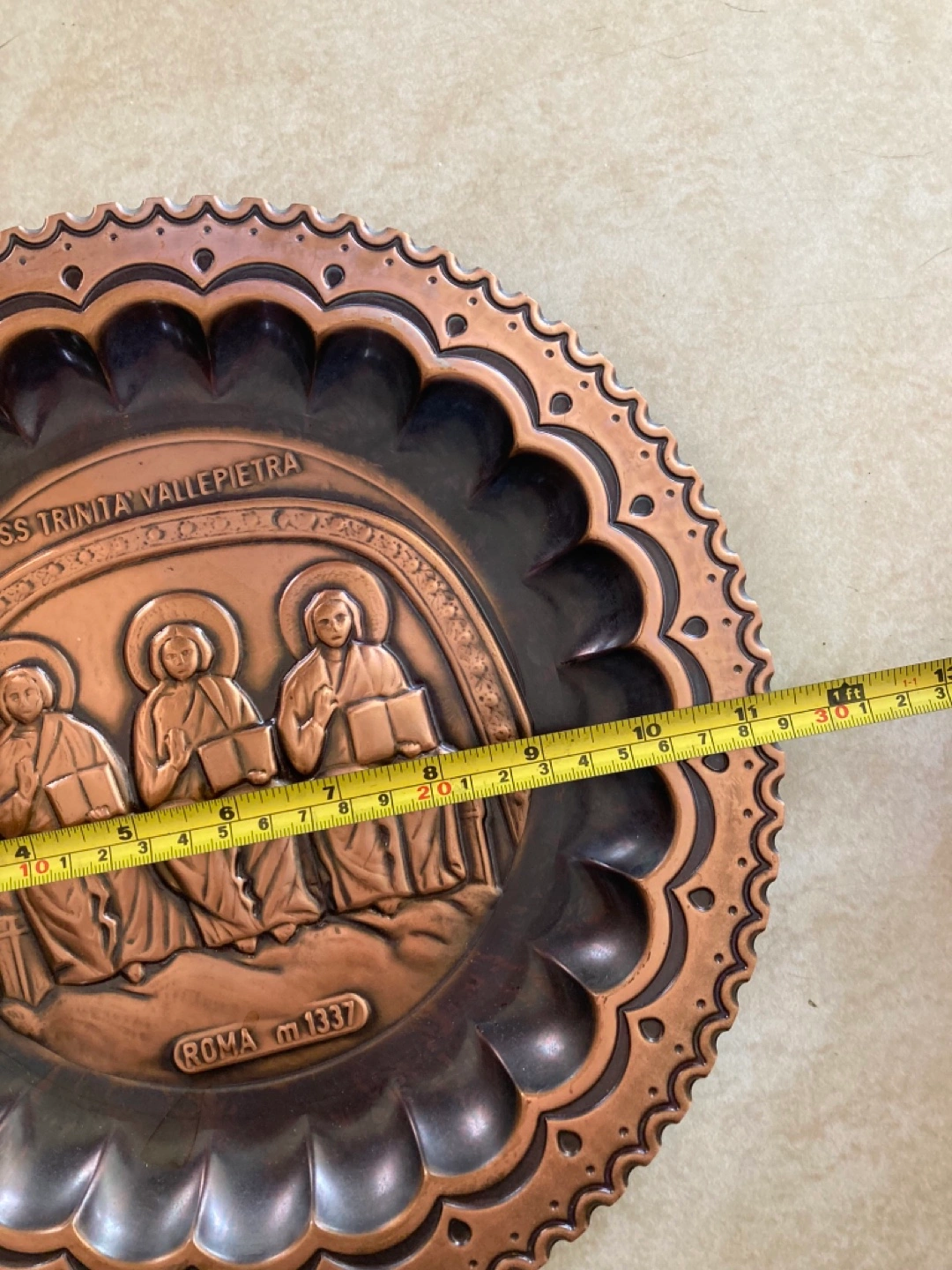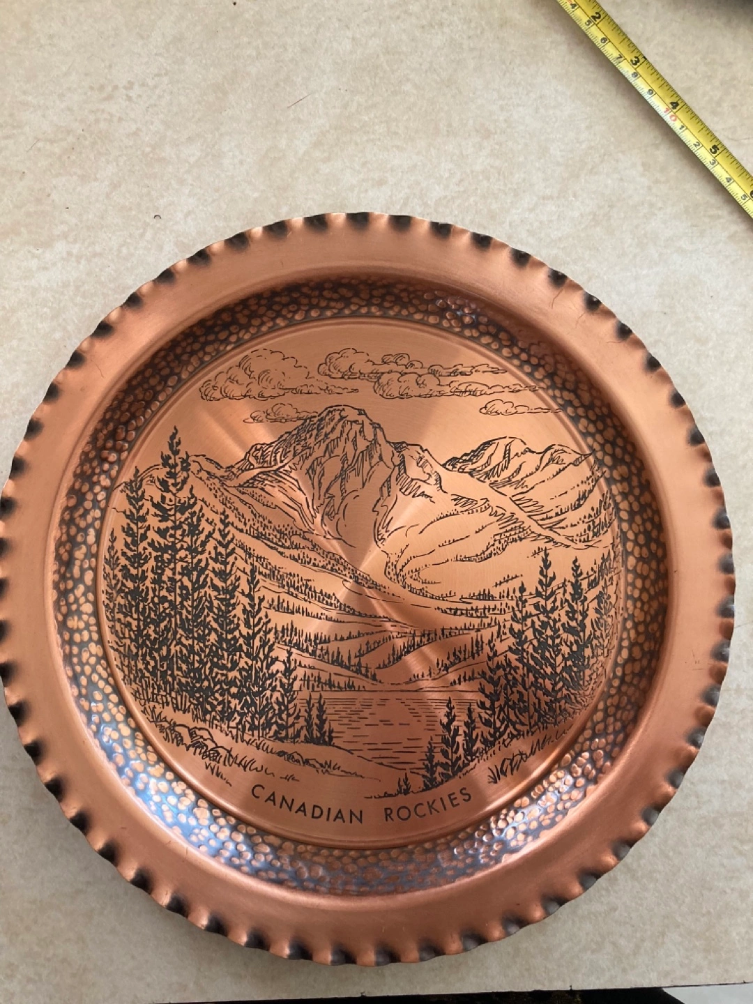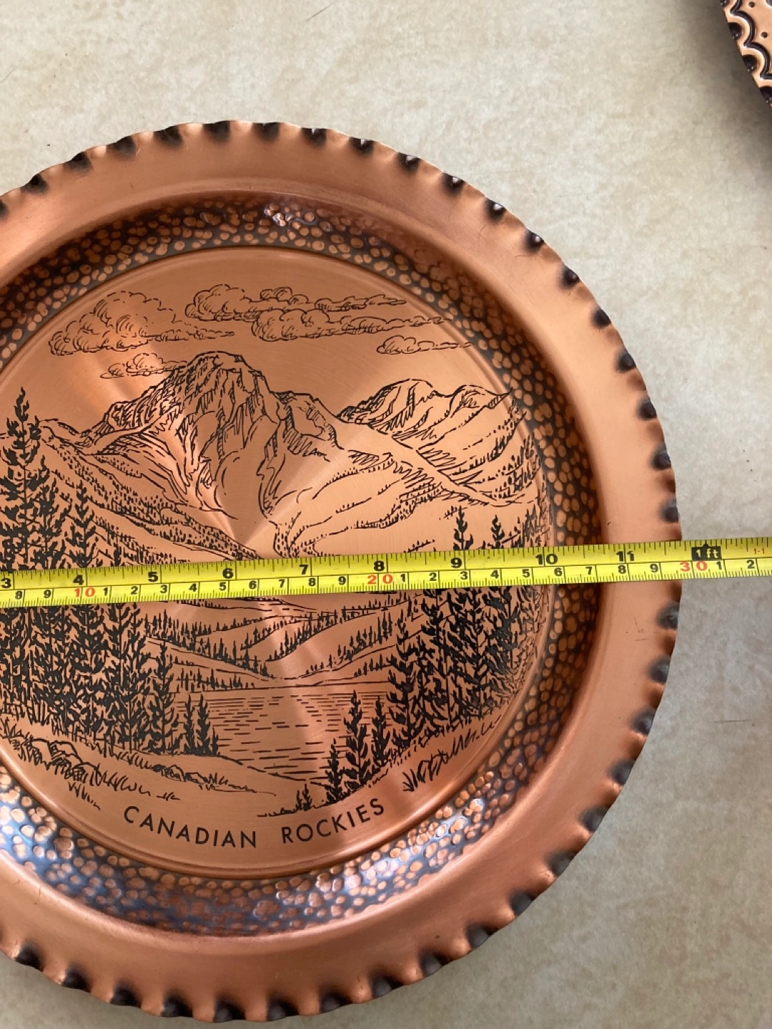 Set of two decorative copper plates. One features a depiction of the Holy Trinity in Rome, the other showcases a landscape of the Canadian Rockies. Both plates have scalloped edges. Diameter approximately 10 inches. $30 each