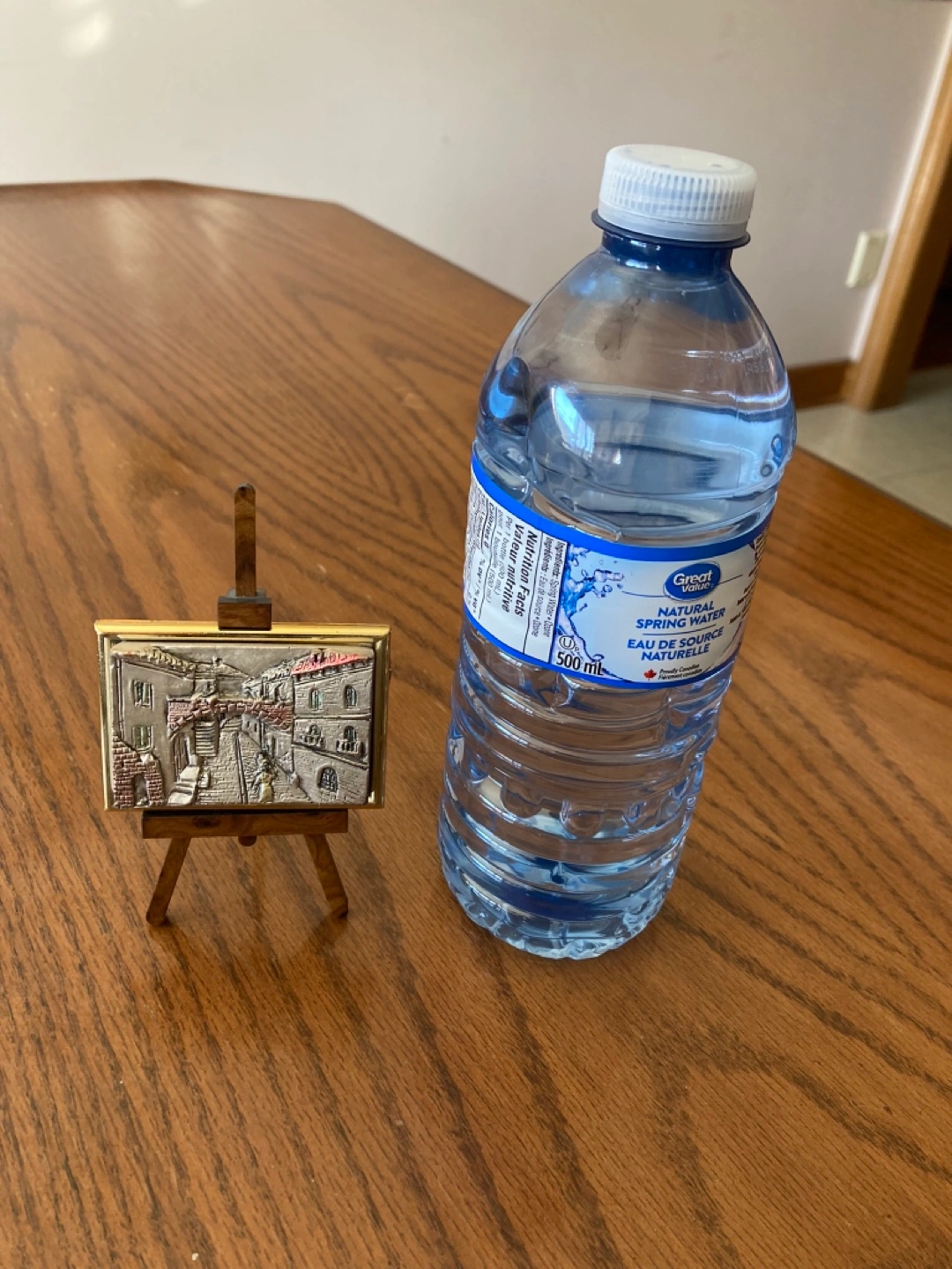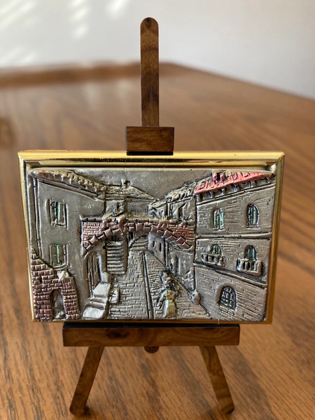 Small, framed relief sculpture. Depicts an Italian street scene. Gold-coloured frame. Wooden easel included. Excellent condition.
