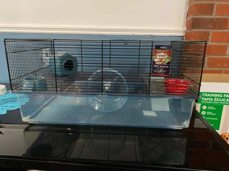Spacious wire and plastic cage. Includes a wheel, hideout, and food bowls. Suitable for hamsters or other small animals.