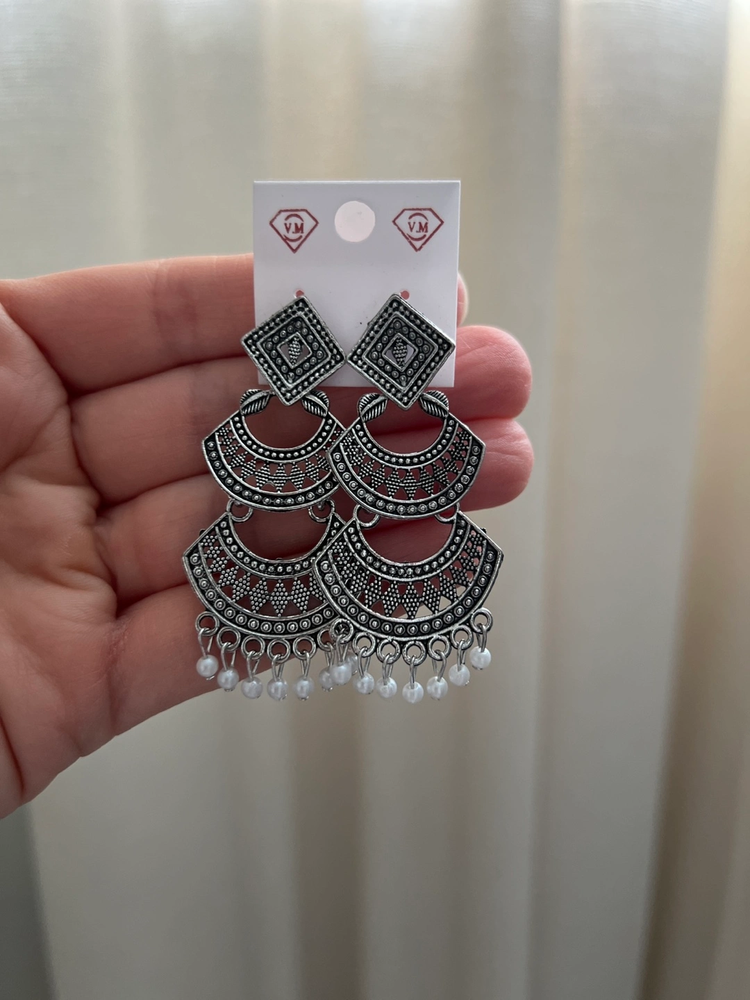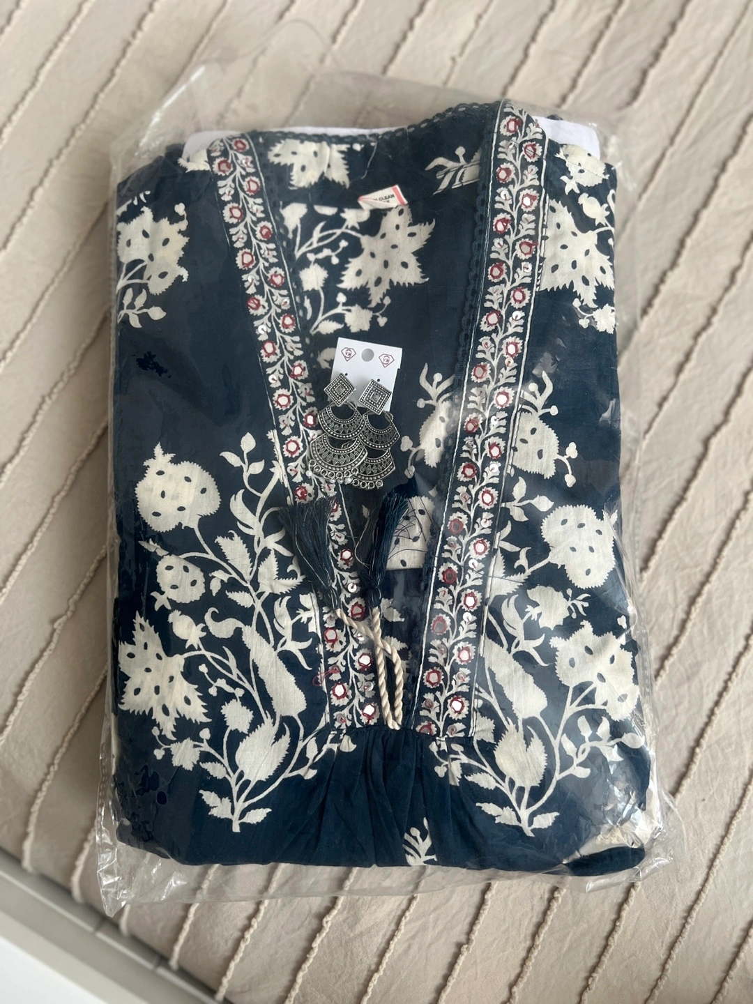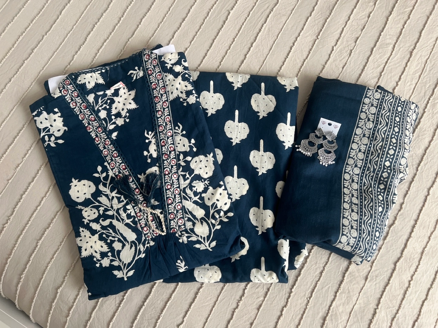 Beautiful navy blue three-piece kurti set. Features a floral block print. Includes a kurta, pants, and dupatta. Comes with a pair of silver earrings. Gorgeous colours and patterns.