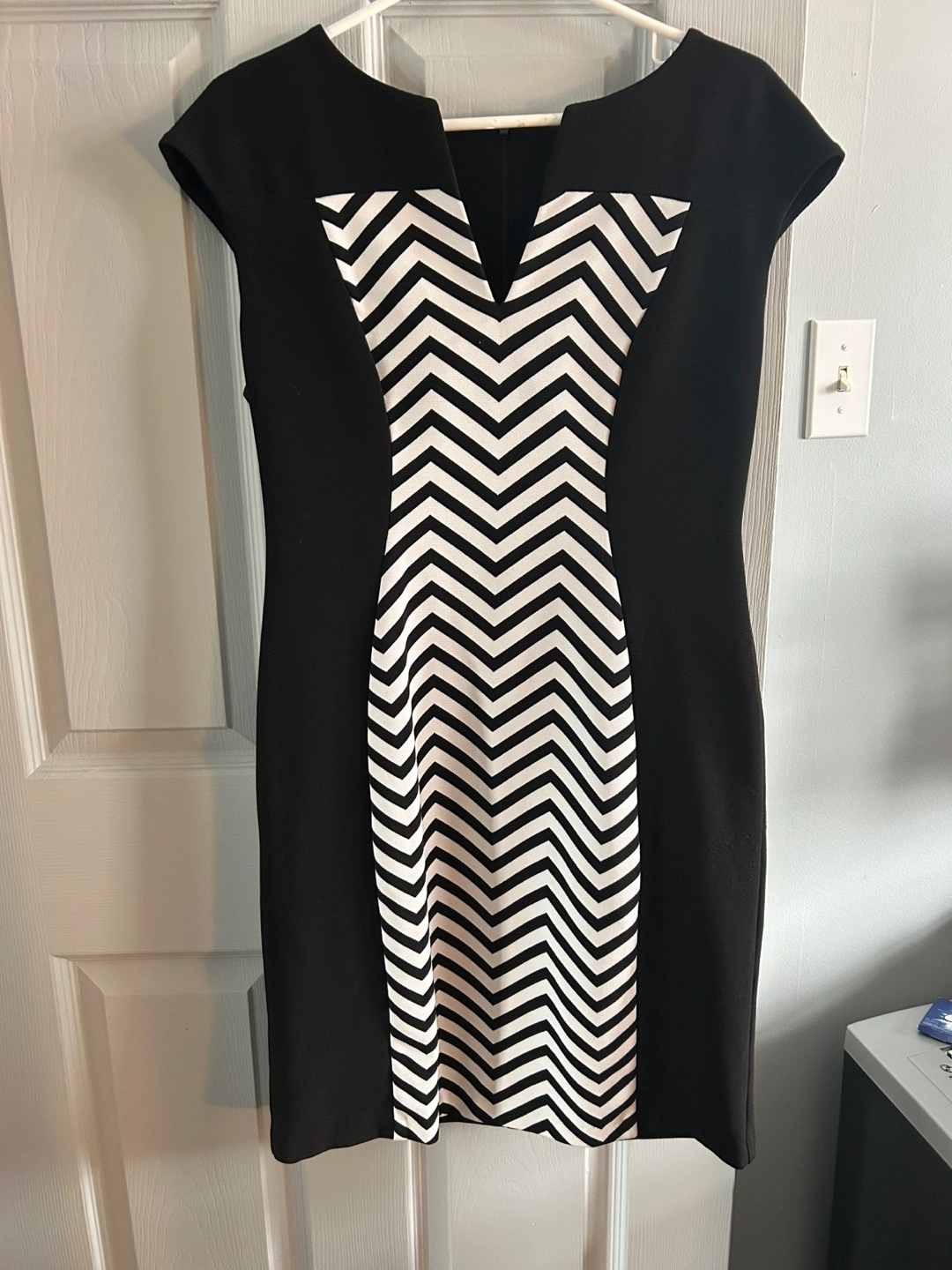 Short sleeve, form-fitting dress. Black and white chevron pattern. V-neck. If interested, I have a pair of shoes that go well with this for $10. Size 8-9.