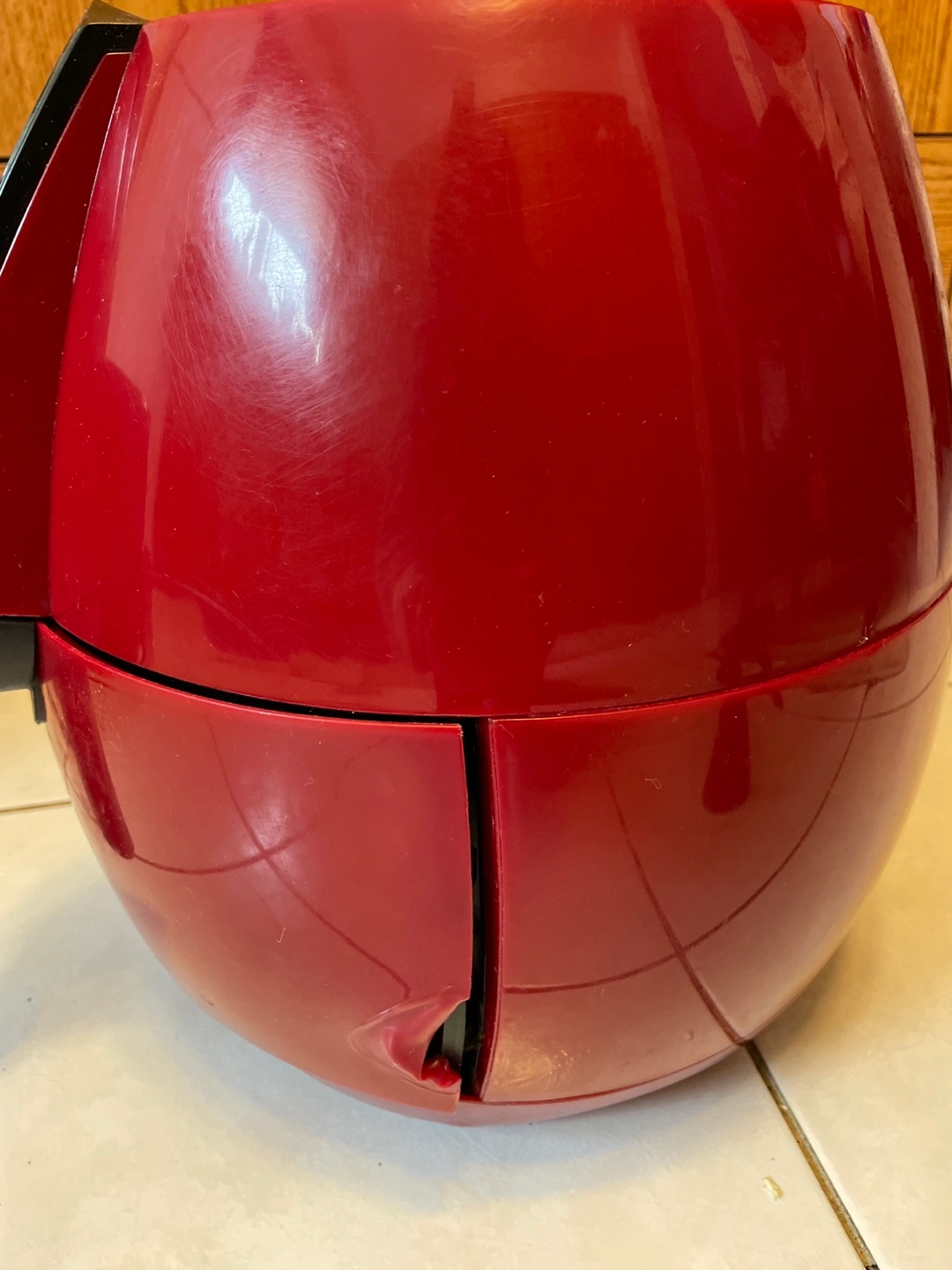 Set of two air fryers. One black, one red. Both have removable baskets. Digital controls on red model.