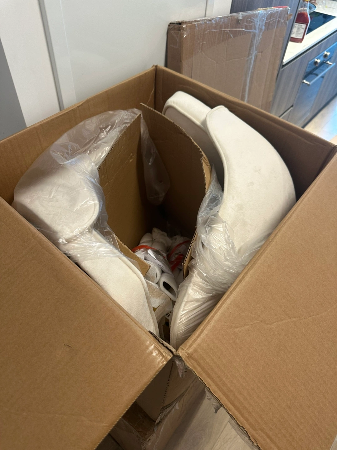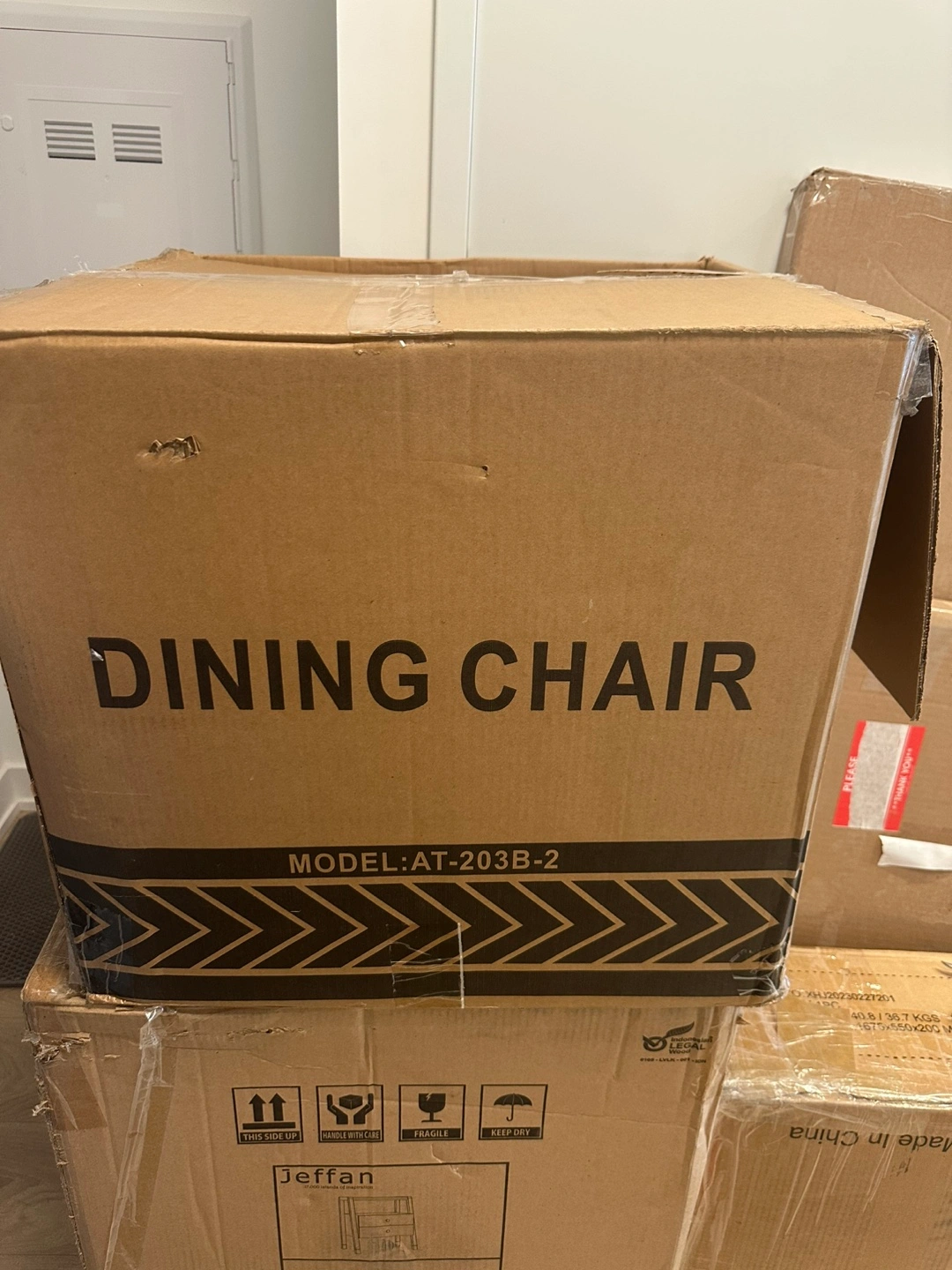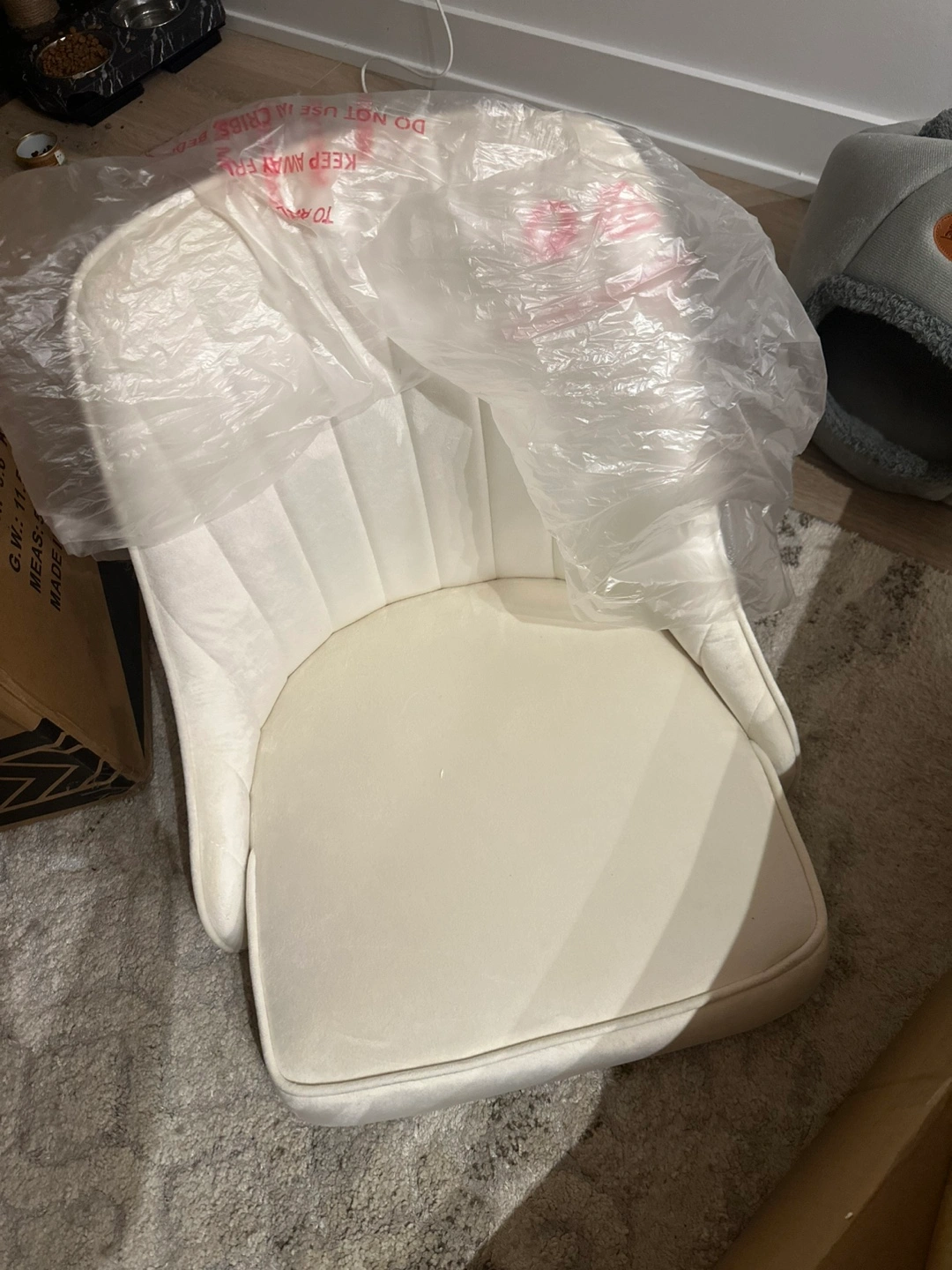 Two brand new white velvet dining chairs. Model AT-203B-2. Still in box. Elegant design. Perfect for modern dining room.