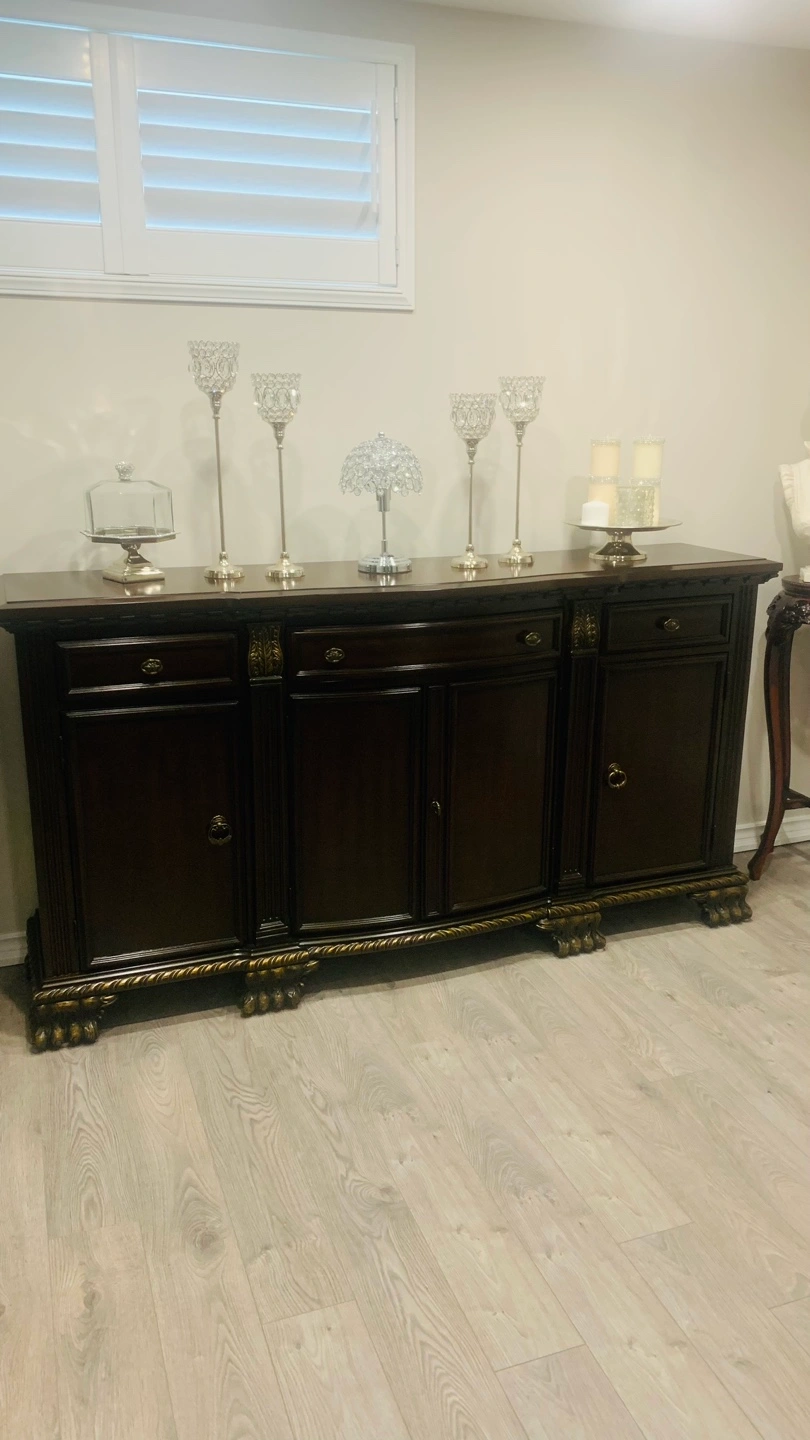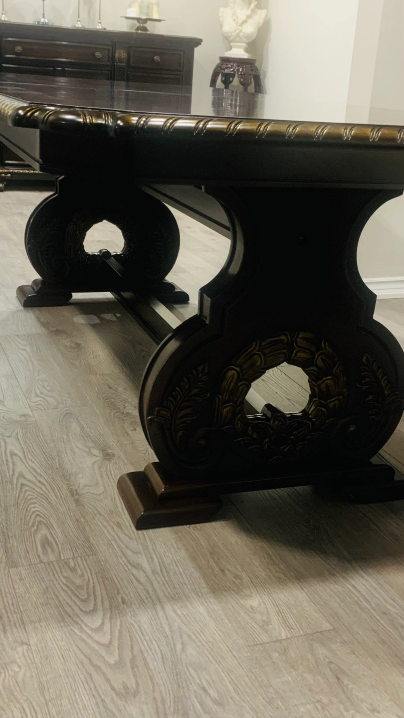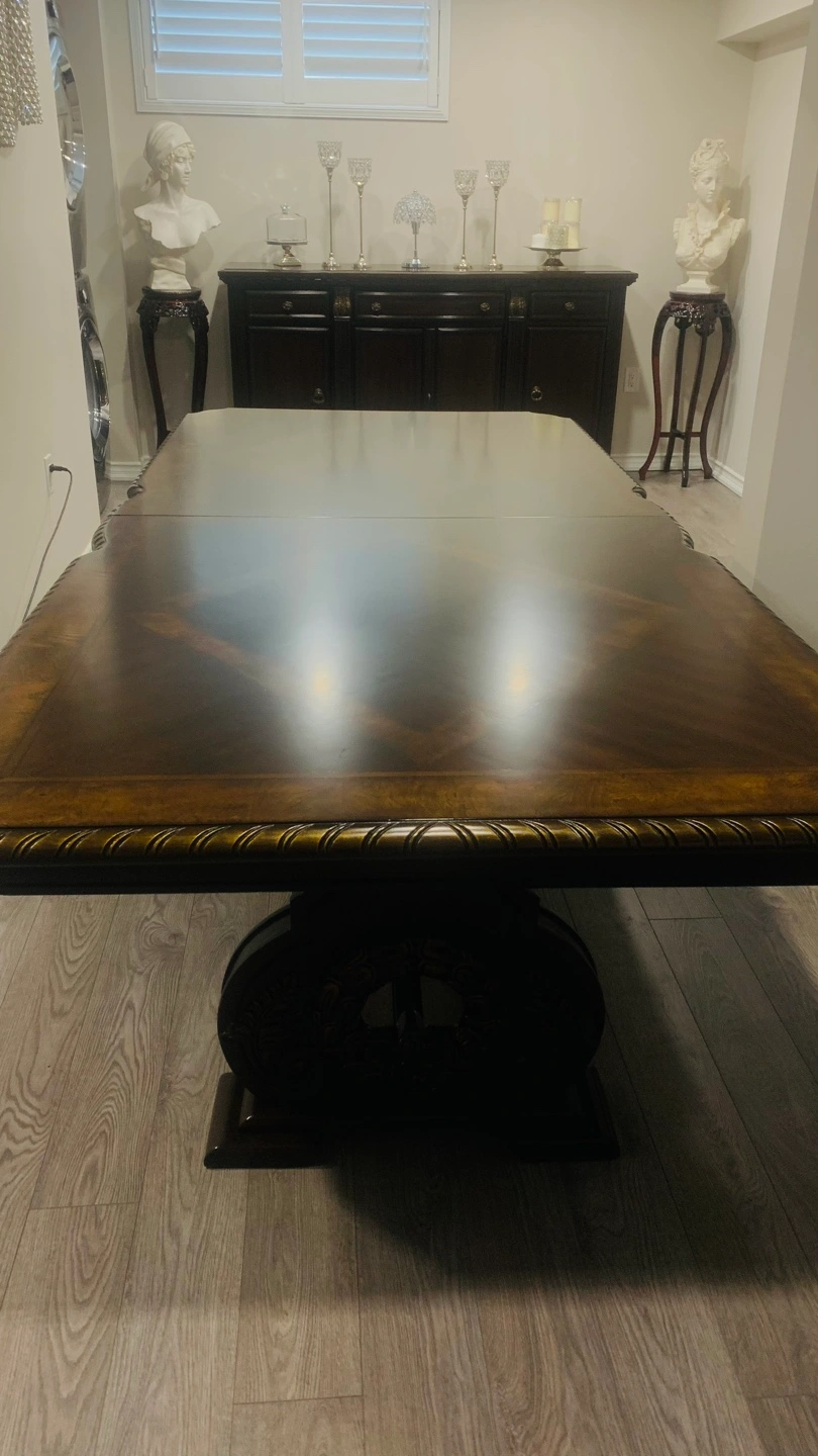 Beautiful dark brown wood dining set. Includes an extendable dining table and a large buffet. Intricate detailing and ornate legs. Perfect for formal dining.