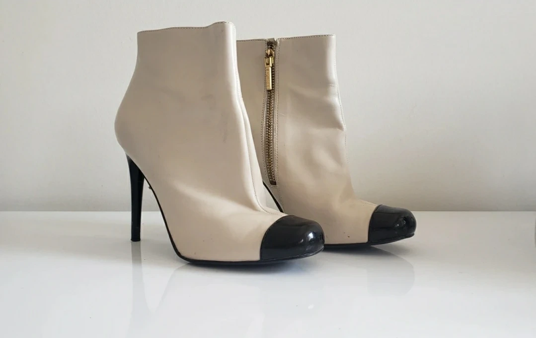 Size 7 Guess zip up ankle boots w/ stiletto heel and tuxedo toe. Chanel-inspired design. Gold hardware. Used but in great condition.