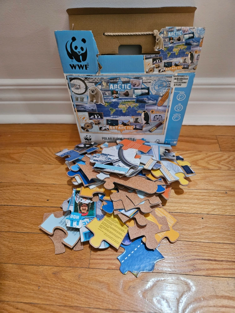 Pre-owned WWF Polar Regions floor puzzle. 49 pieces. Features images of Arctic and Antarctic wildlife. Box shows some wear. only best offer pls.