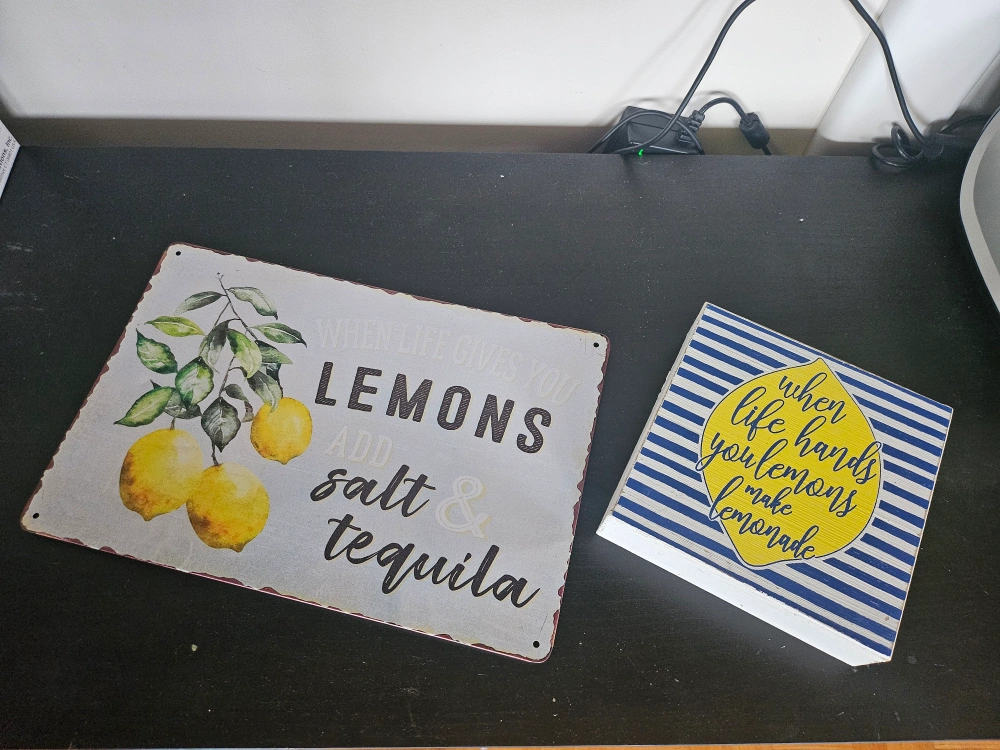 Two decor signs When Life Gives You Lemons... signs no longer needed. One is metal material like a license plate. The other is a wood box perfect for sitting on a shelf. Perfect for kitchen or bar. $3 for both pick up as I do not have a vehicle