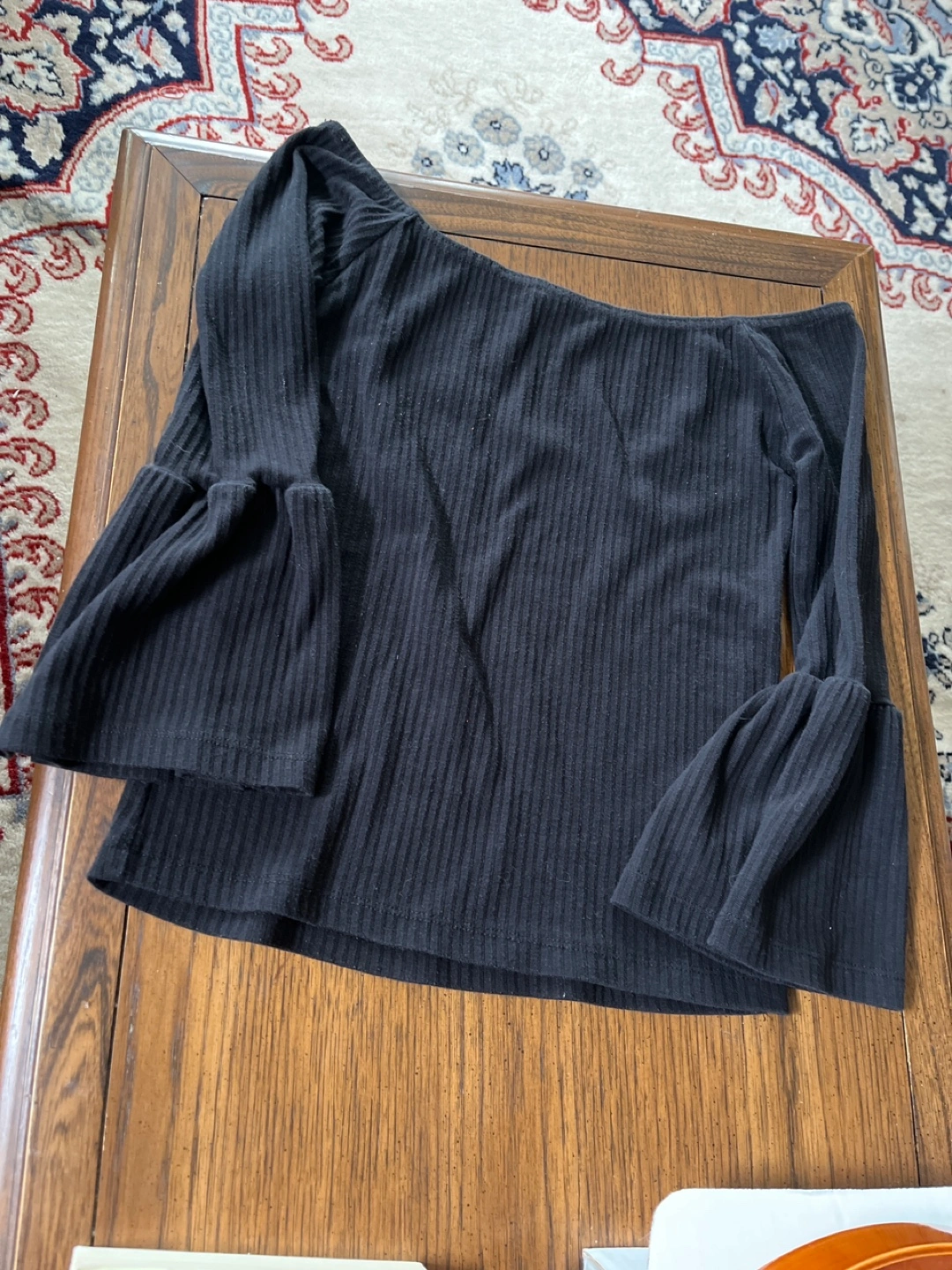 Black ribbed top with bell sleeves. Small area of mending on one seam on the body.
