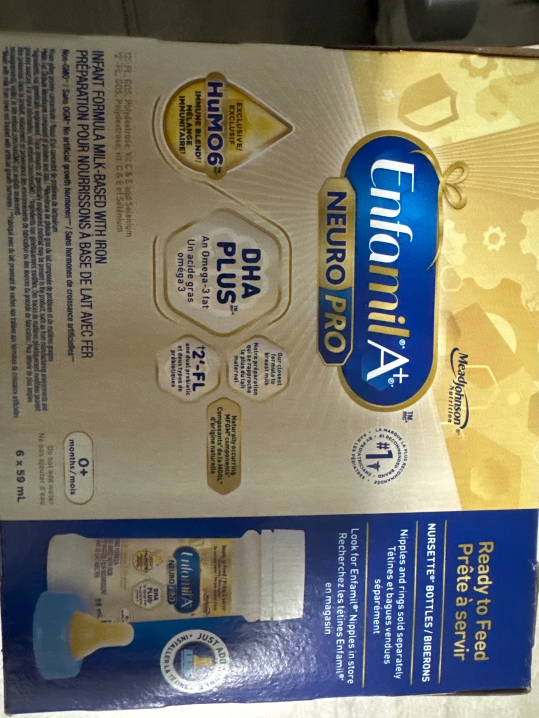 Enfamil NeuroPro infant formula, ready-to-feed bottles. 0+ months. Contains DHA plus and HuMO6 immune blend.