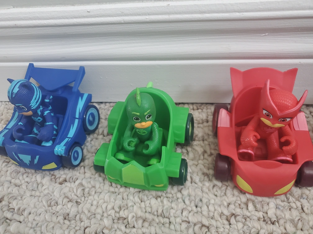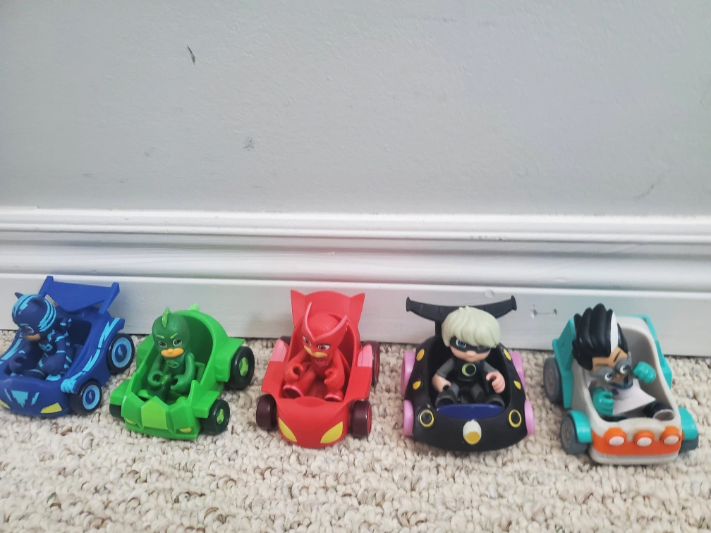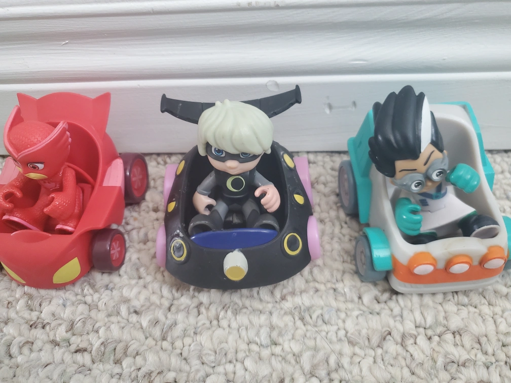 Five PJ Masks vehicles with characters. Includes Catboy, Owlette, Gekko, Romeo, and Night Ninja. Small collectible toys, great for imaginative play.