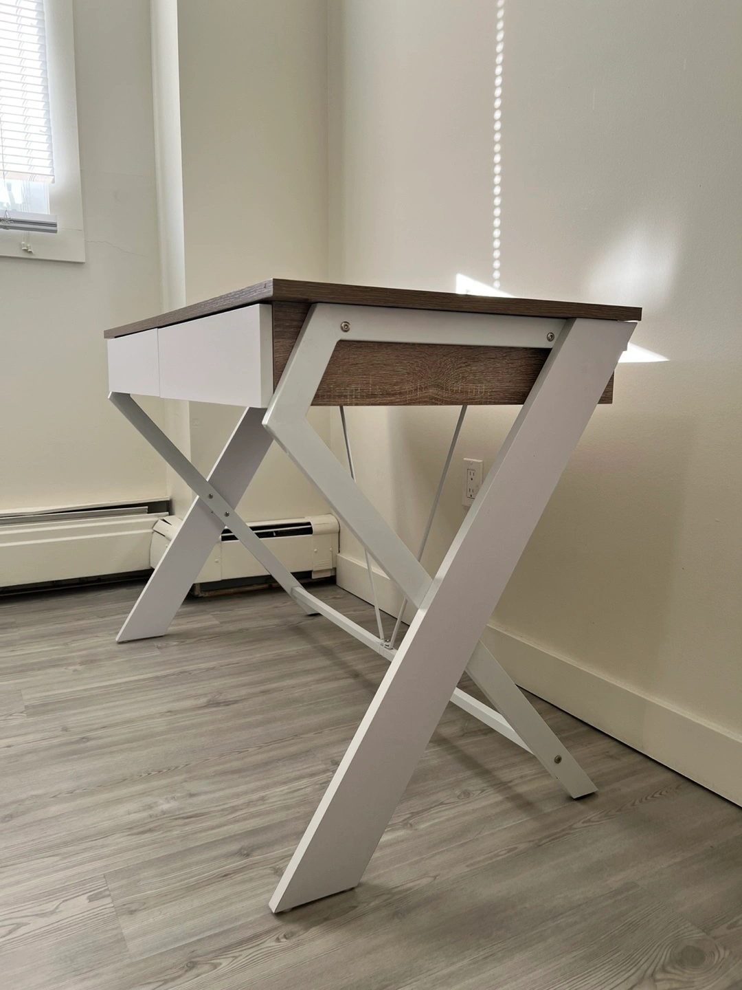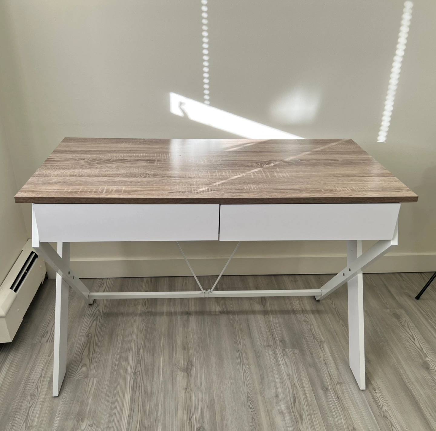 Stylish writing desk. Two drawers. White legs and frame. Wood top. Good condition.