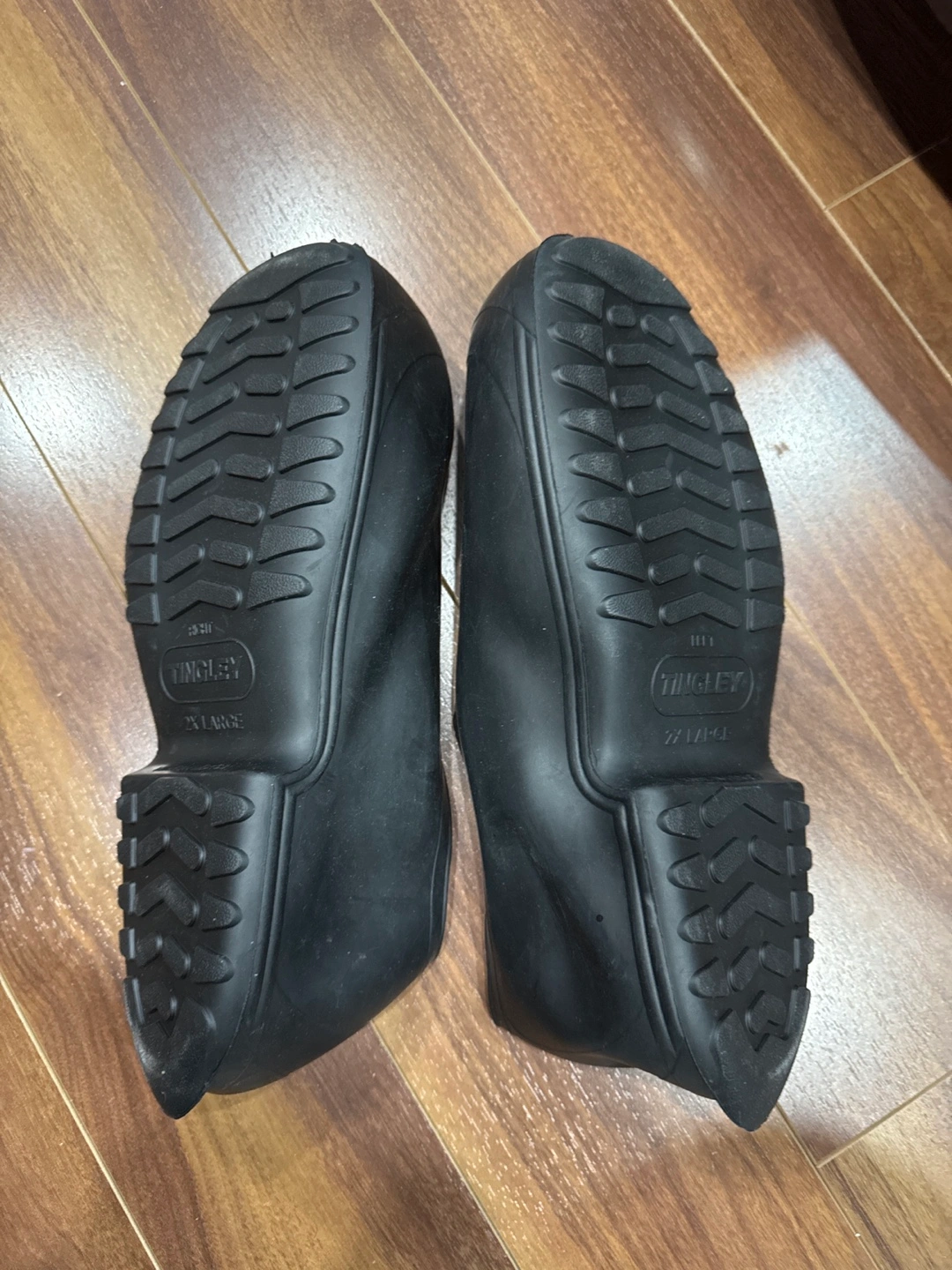 Pair of black rubber shoe covers. X-Large size. Good for protecting shoes from dirt and moisture. Slip-on design. Durable rubber construction. Textured soles.