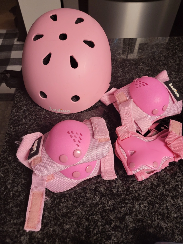 Pink children's bicycle helmet and protective gear set. Includes elbow and knee pads. Great for cycling, skateboarding, or scootering.