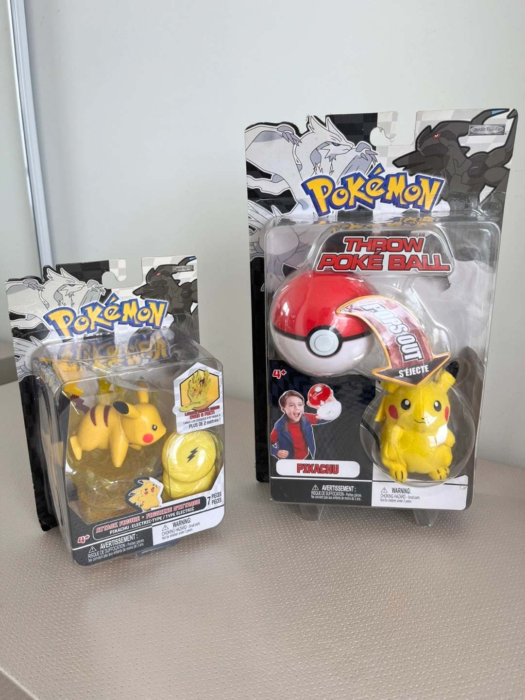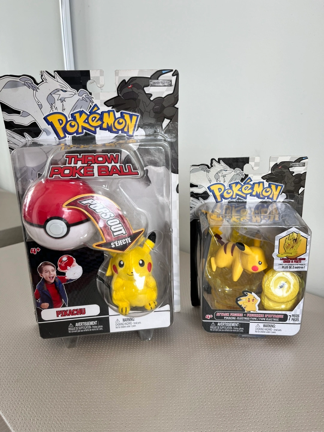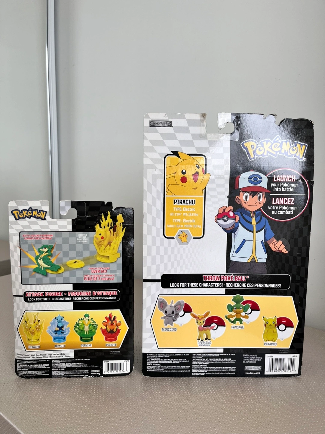 Two Pokémon playsets. One features a throw Poke Ball and Pikachu figure. The other includes an attack figure and a launching mechanism. Both are new and unopened. The boxes are damaged