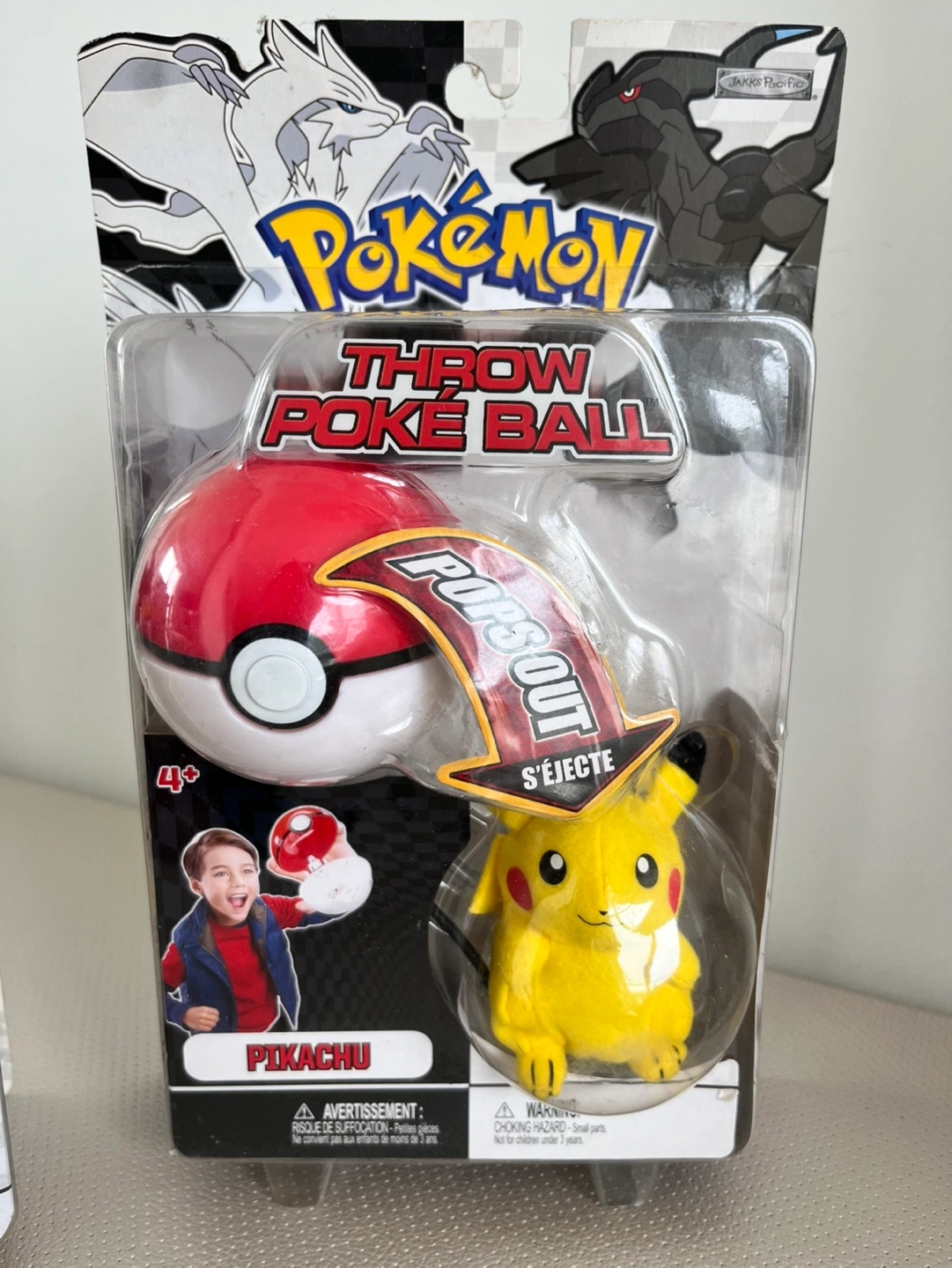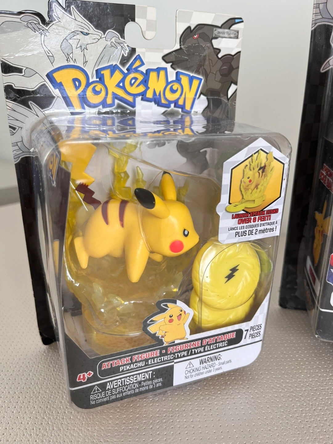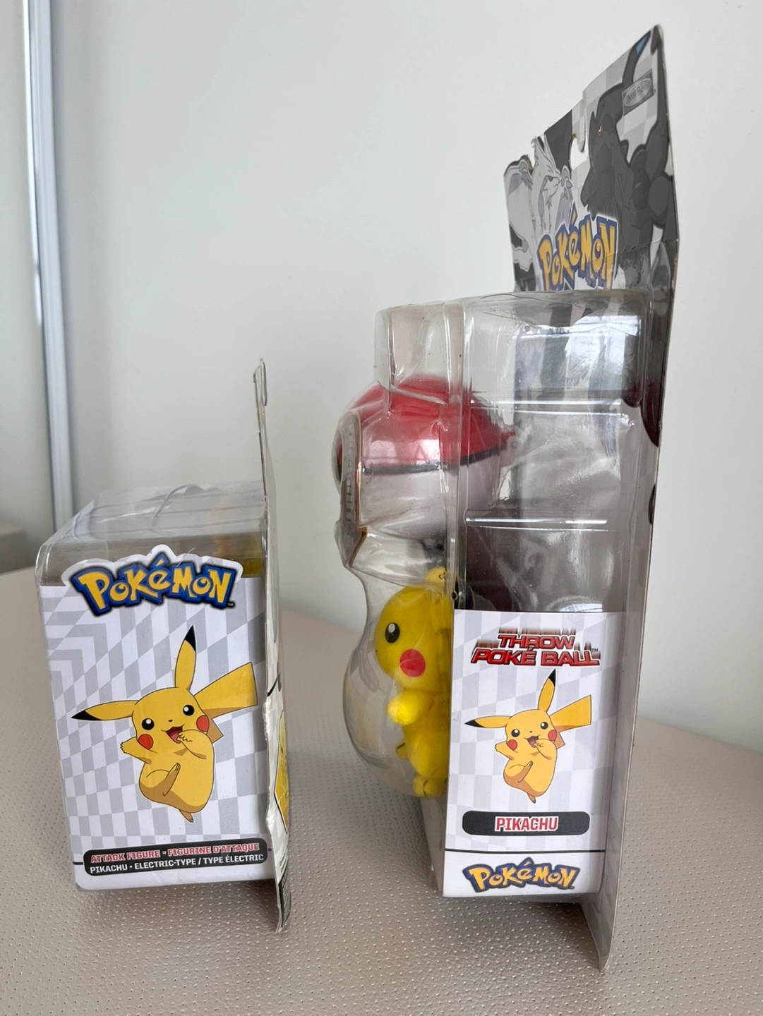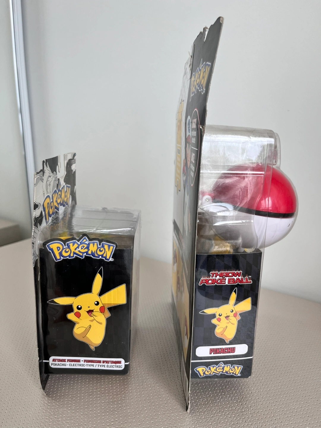 Two Pokémon playsets. One features a throw Poke Ball and Pikachu figure. The other includes an attack figure and a launching mechanism. Both are new and unopened. The boxes are damaged