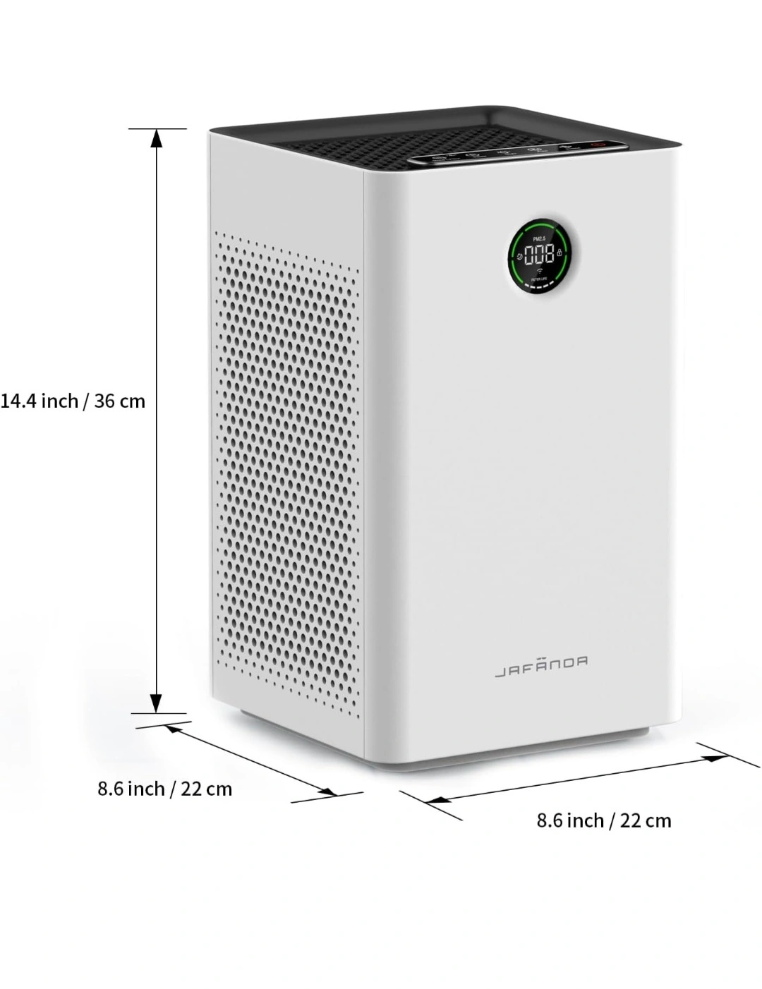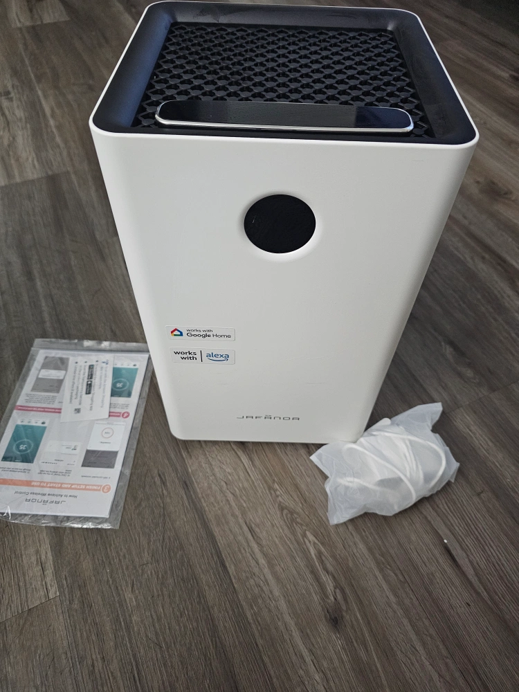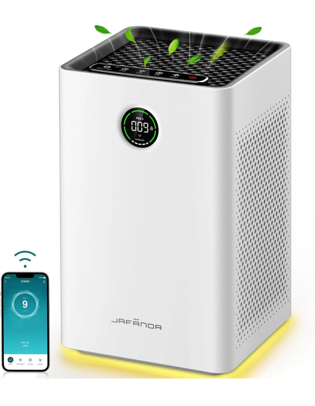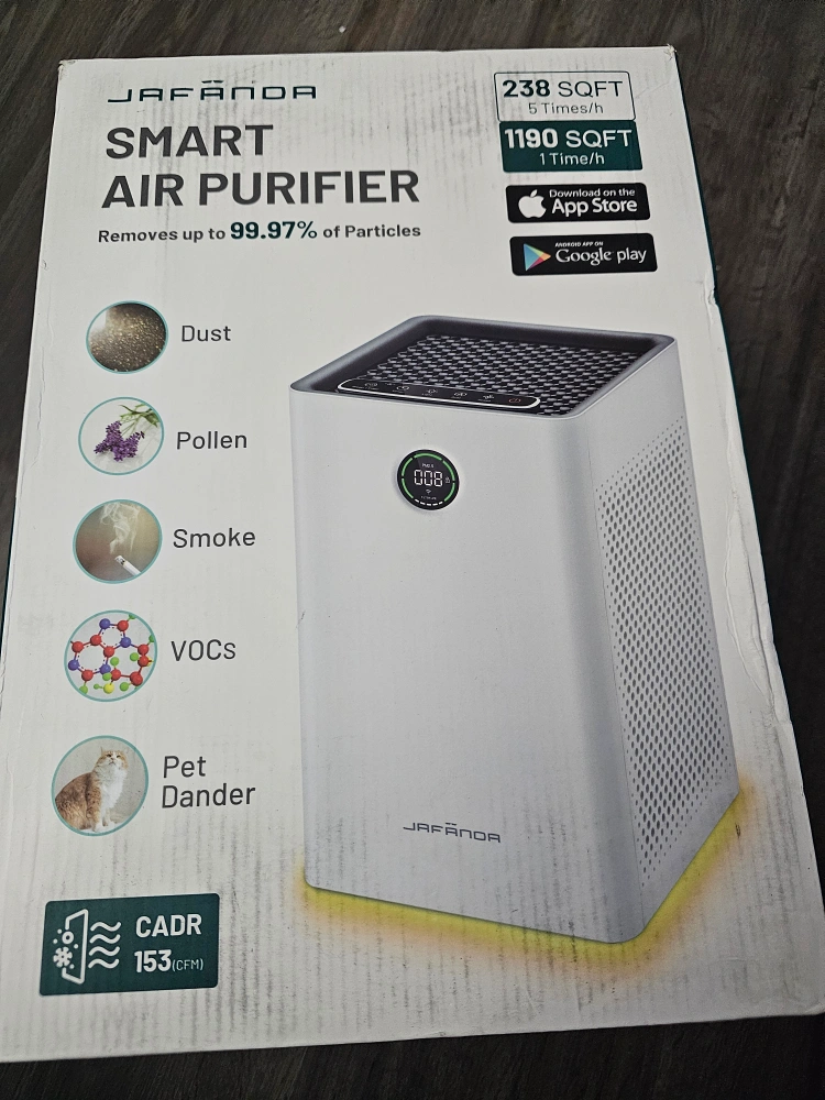 Smart air purifier. Works with Google Home and Alexa. Removes up to 99.97% of particles. Dust, pollen, smoke, VOCs, and pet dander. CADR 153 (cfm). Compact design, suitable for various rooms. Includes power cord and user manual.