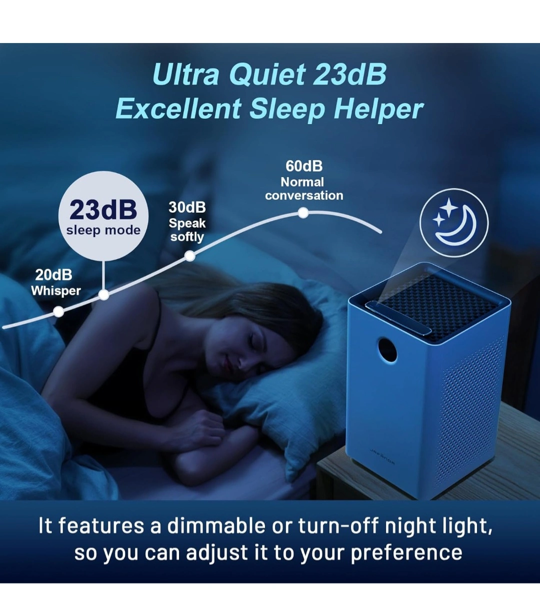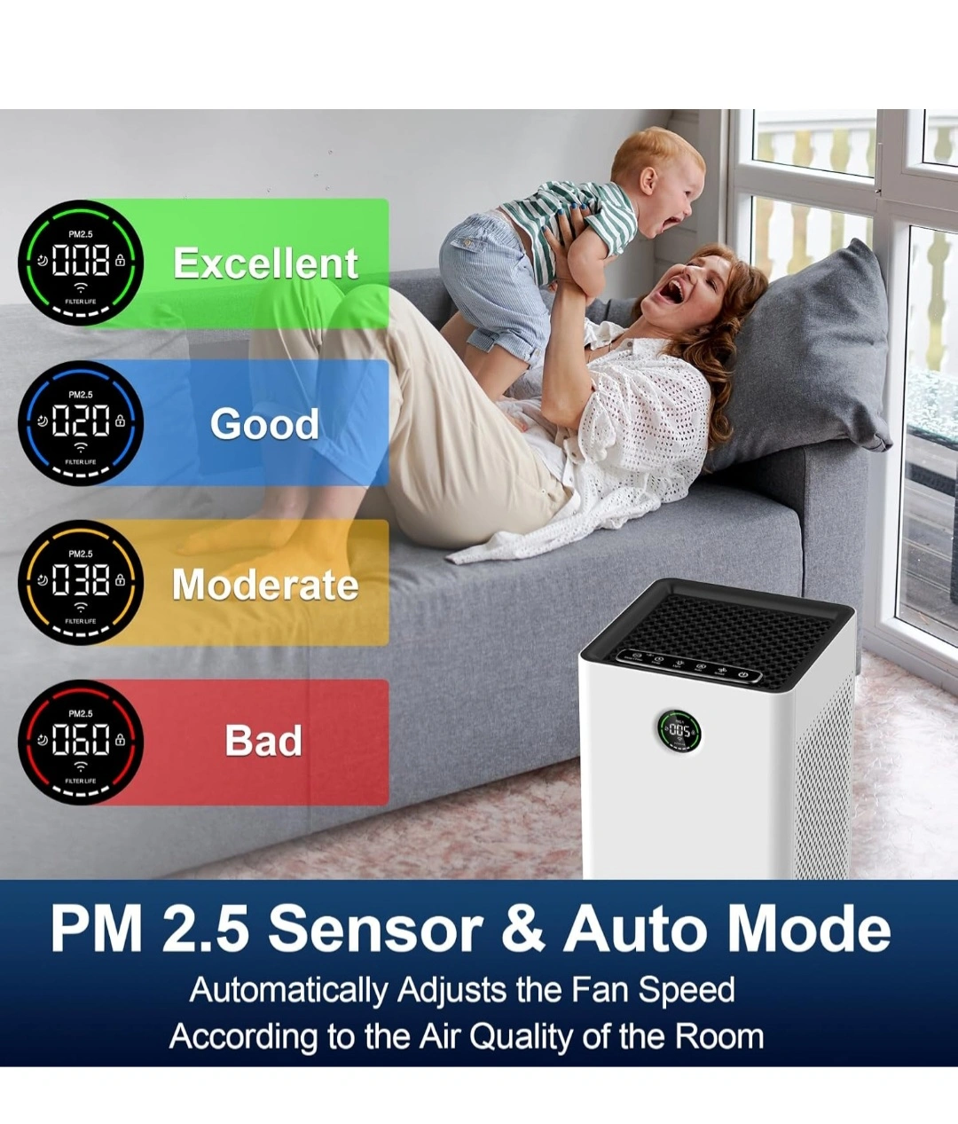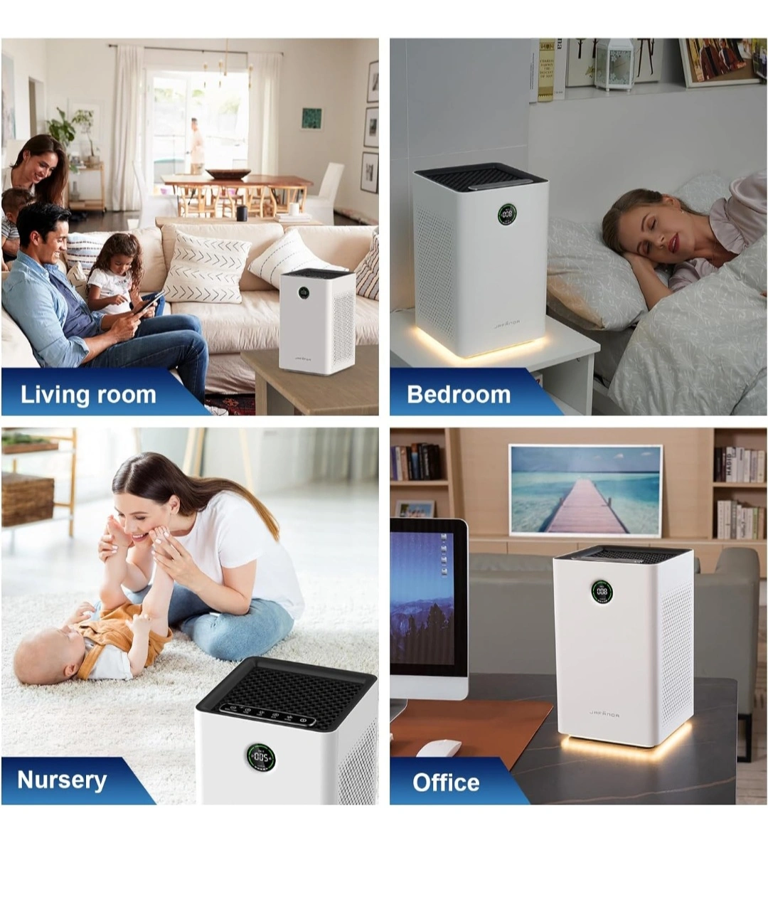 Smart air purifier. Works with Google Home and Alexa. Removes up to 99.97% of particles. Dust, pollen, smoke, VOCs, and pet dander. CADR 153 (cfm). Compact design, suitable for various rooms. Includes power cord and user manual.