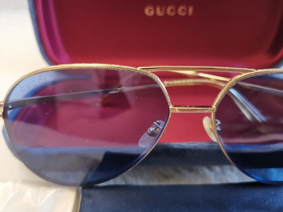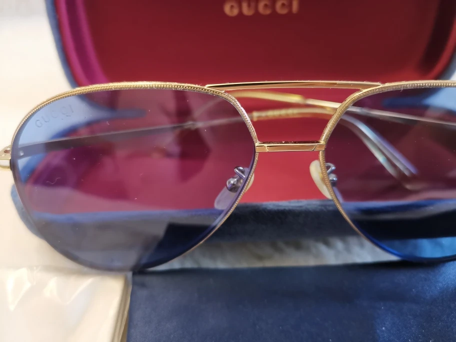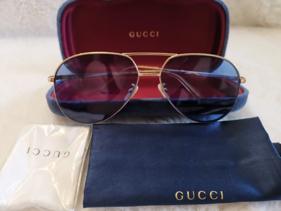 27Authentic Gucci aviator sunglasses. Gold-toned metal frame. Blue gradient lenses. Includes case and cleaning cloth. Excellent condition.
