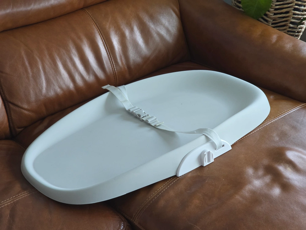 Portable changing station for baby. White soft rubber with grey straps to hold baby furing diaper changes. Great for travel and small spaces. Used but in good condition.