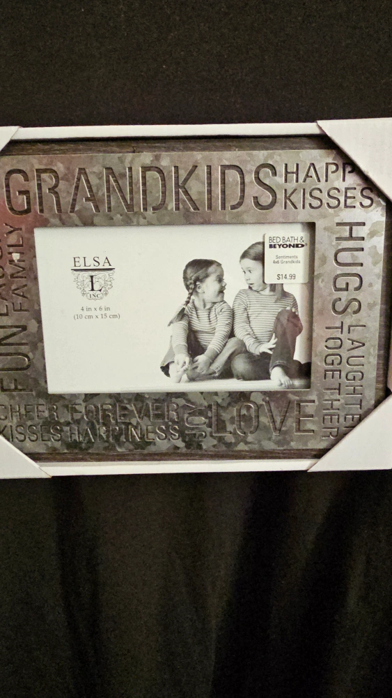 New rectangular picture frame, originally from BBB. Metal with stencil letter cut outs over wood. Beautiful accent for the home.