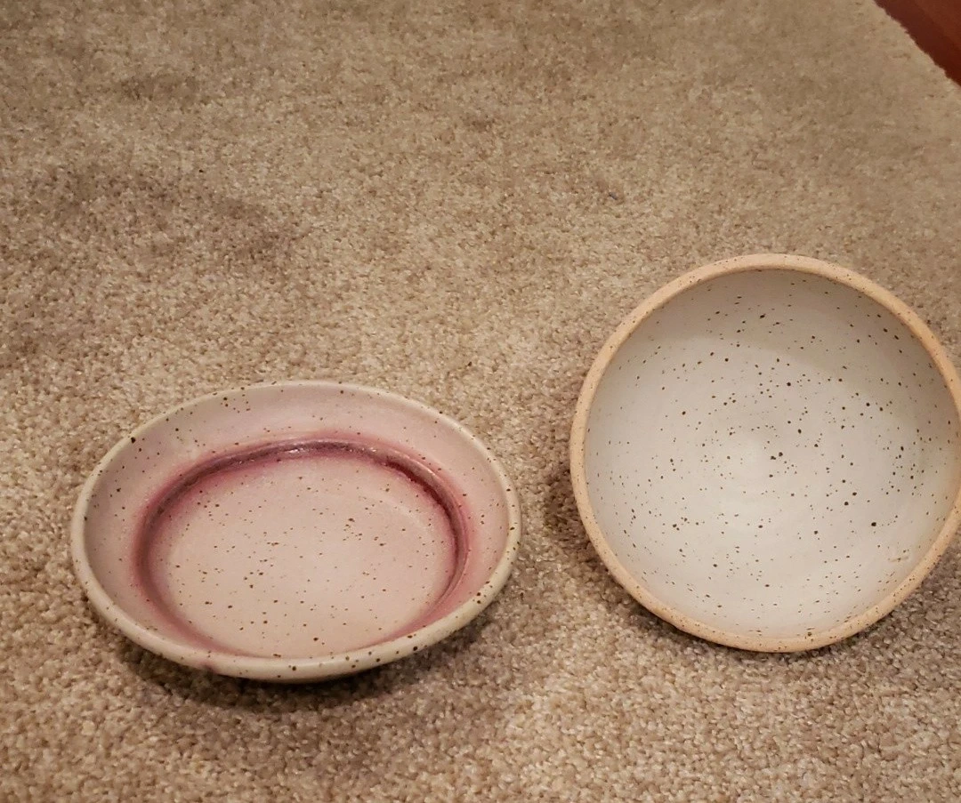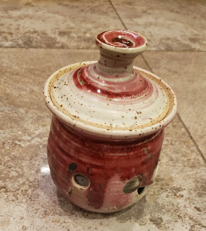 Unique handmade pottery butter dish and Garlic Keeper Features a swirling, hand-painted design in shades of pink and maroon. Includes lids. Lovely addition to any kitchen.$40 for both.In mint condition.