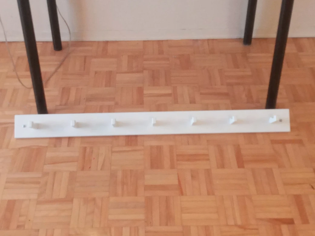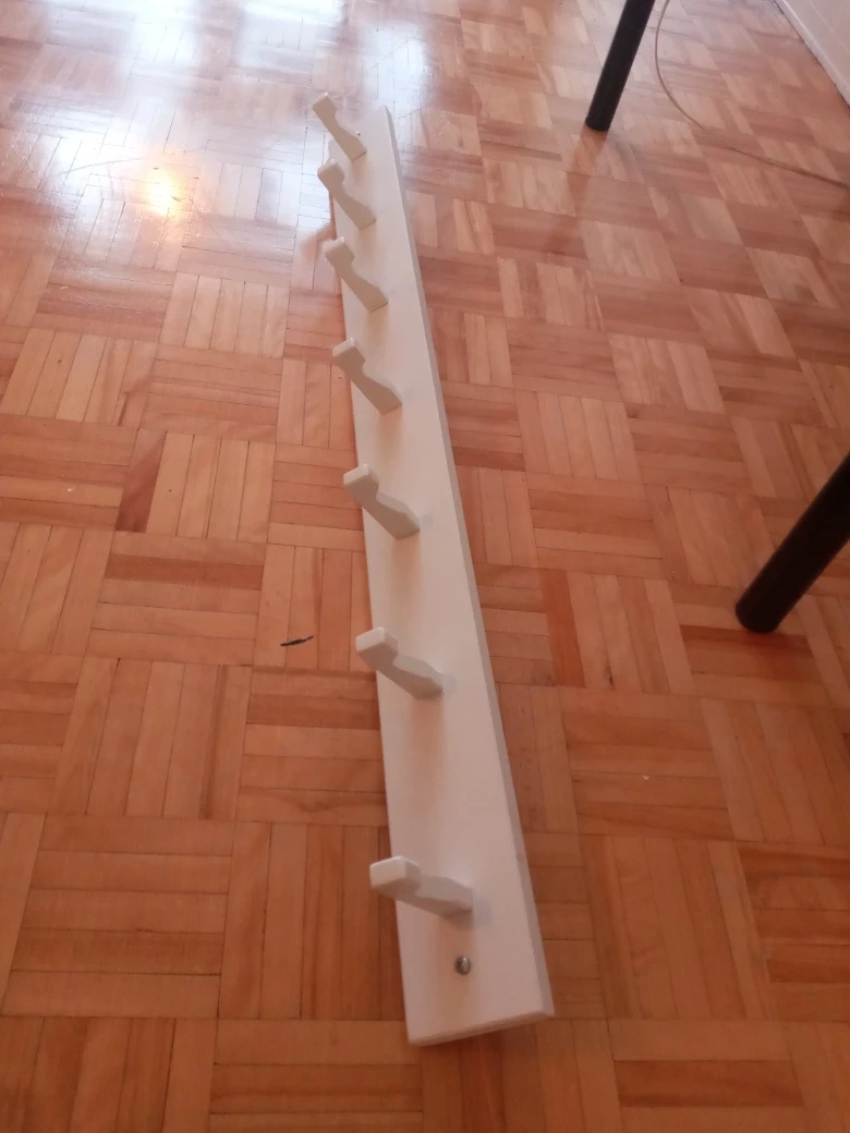 White coat rack, eight hooks, wall-mounted. Simple design, good for entryway or bedroom.