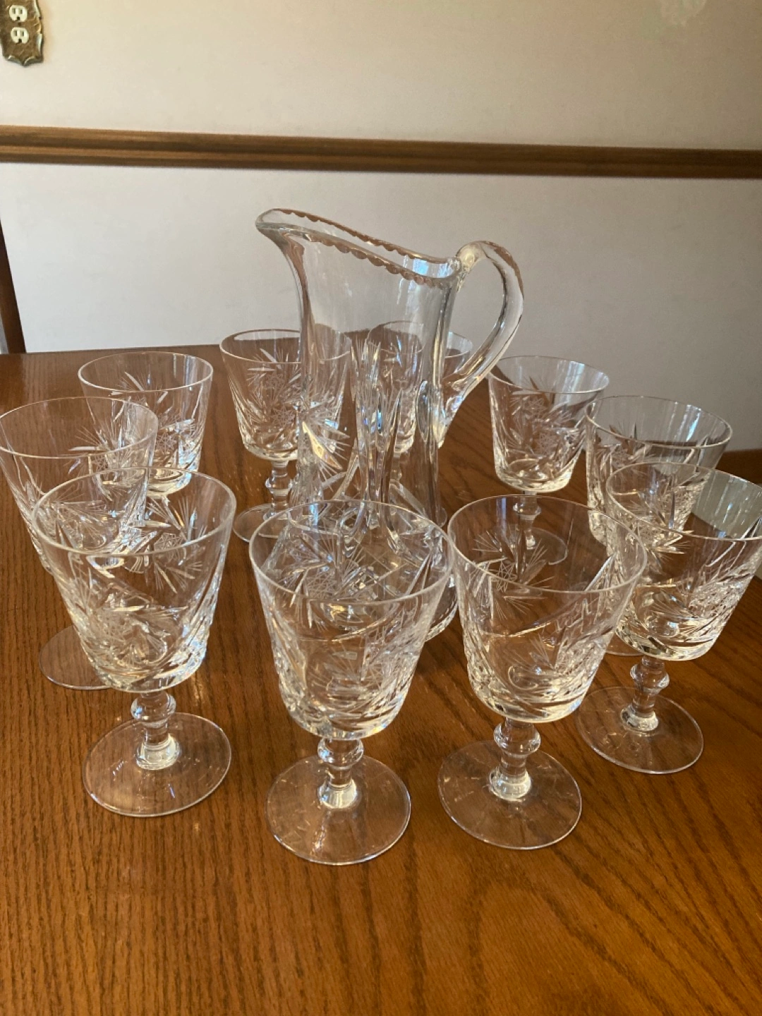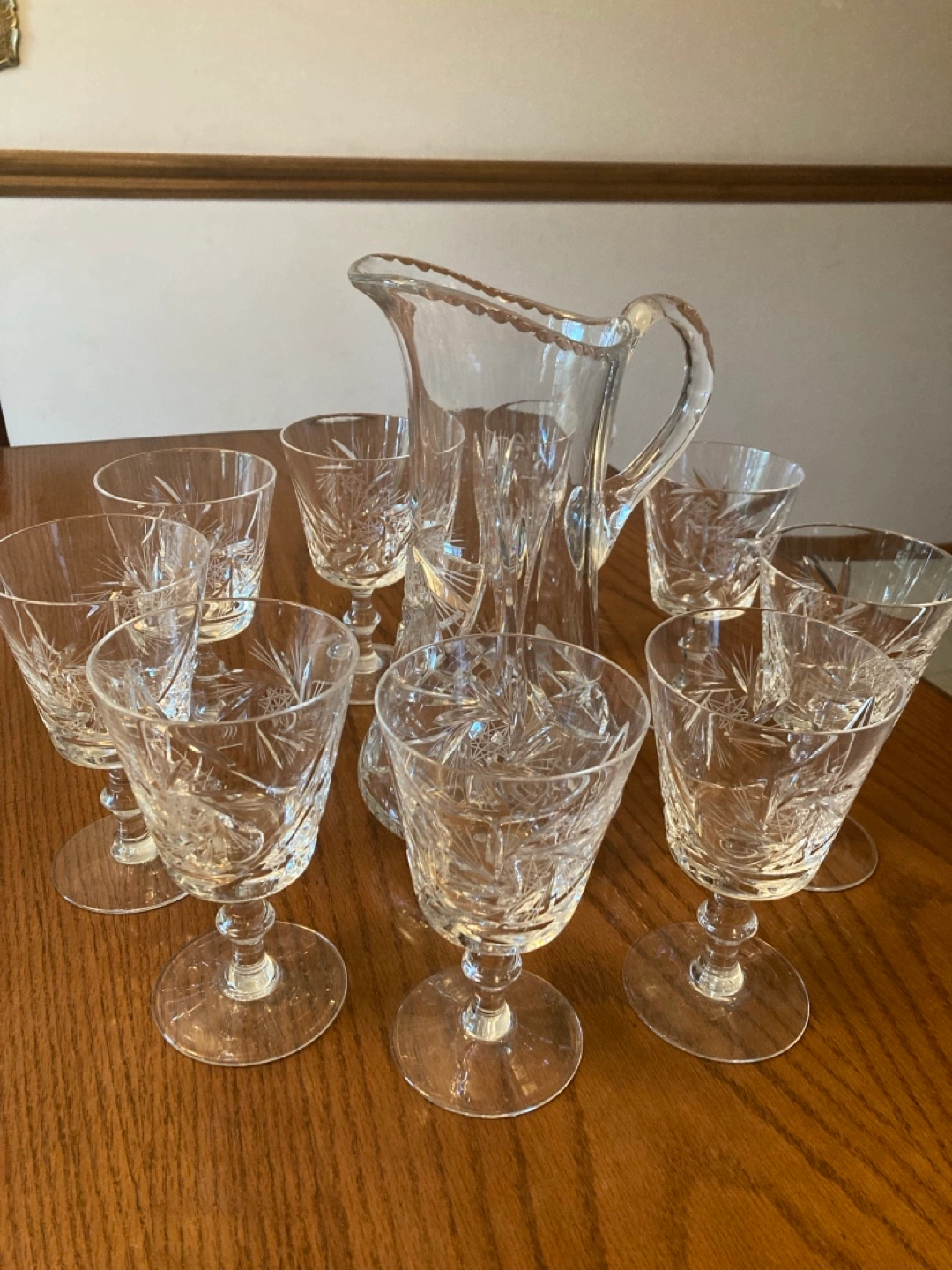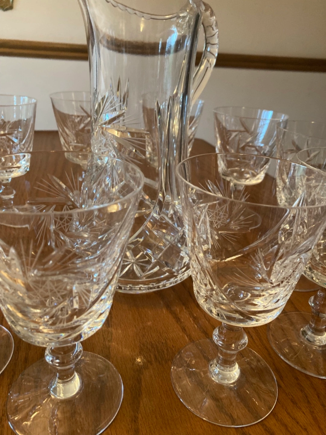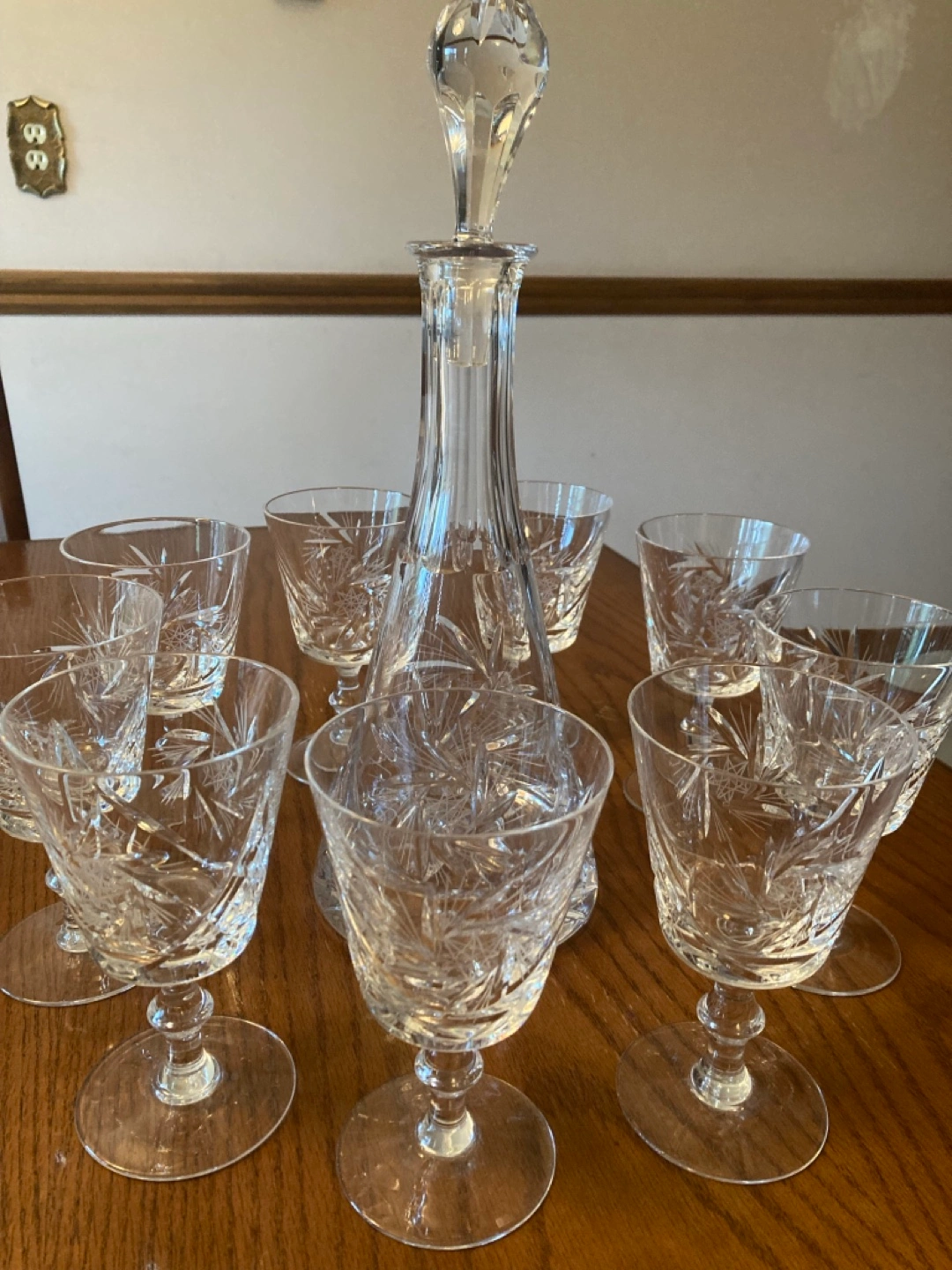 Elegant crystal decanter and eight matching glasses. Intricate pinwheel starburst pattern. Beautiful addition to any home bar.