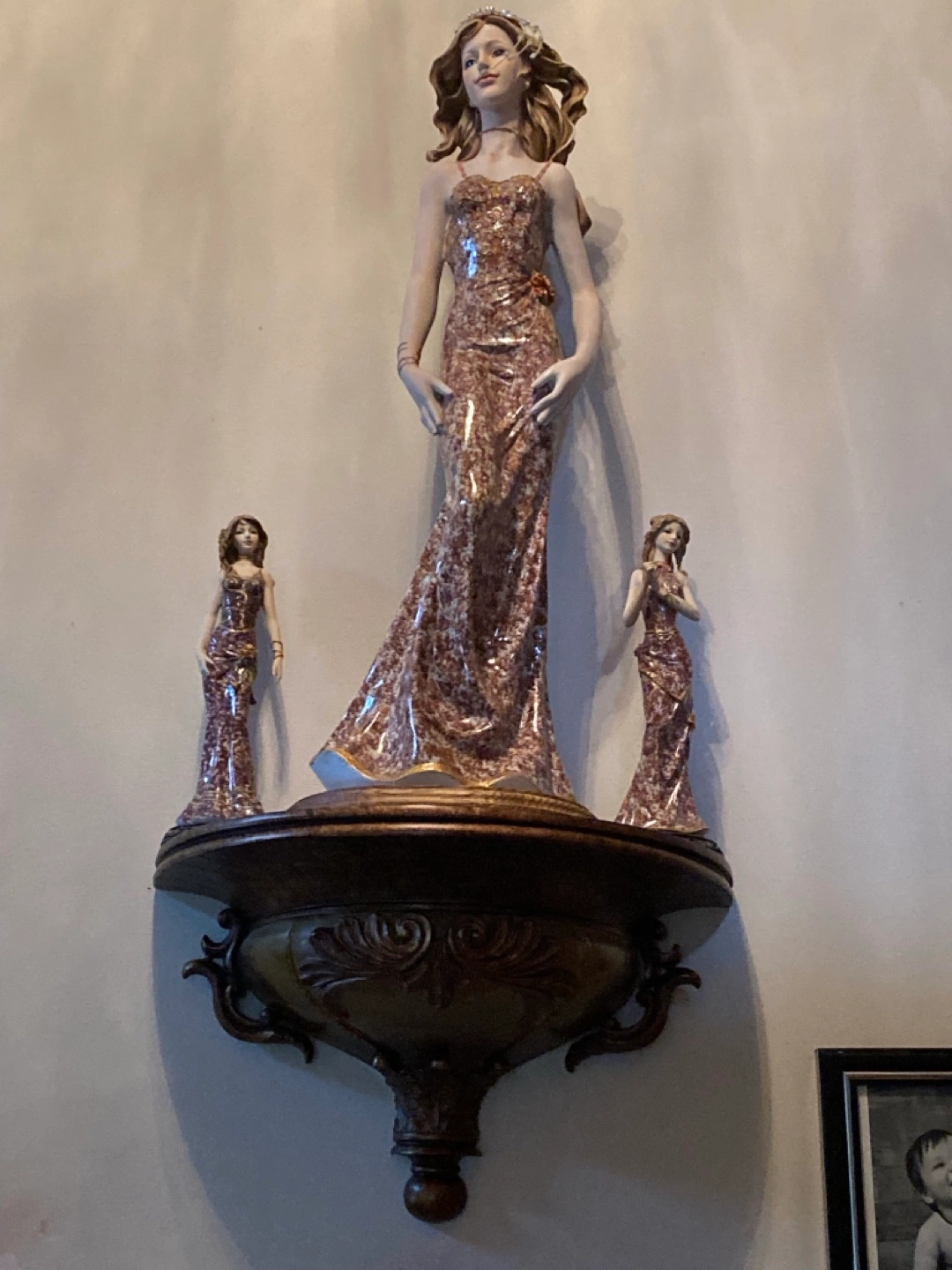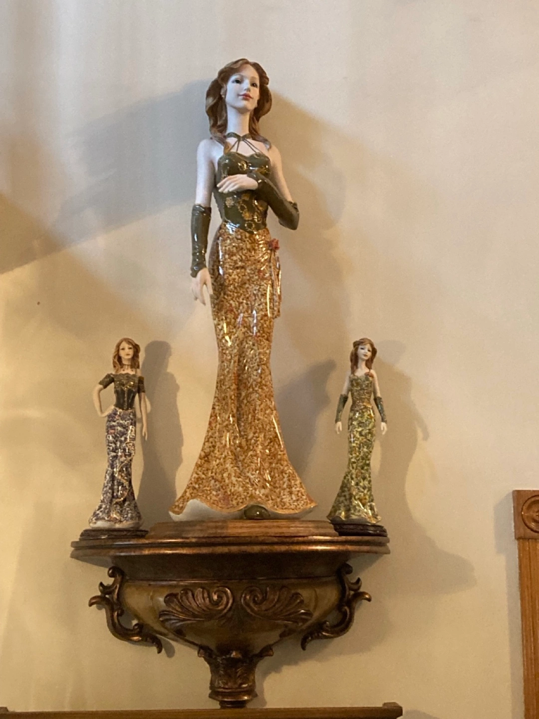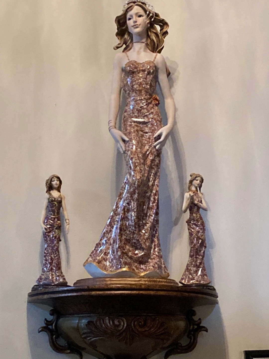 Three lovely porcelain figurines. Large central piece features a woman in a flowing gown. Two smaller matching figurines. Beautiful detail. Perfect for collectors or home décor.