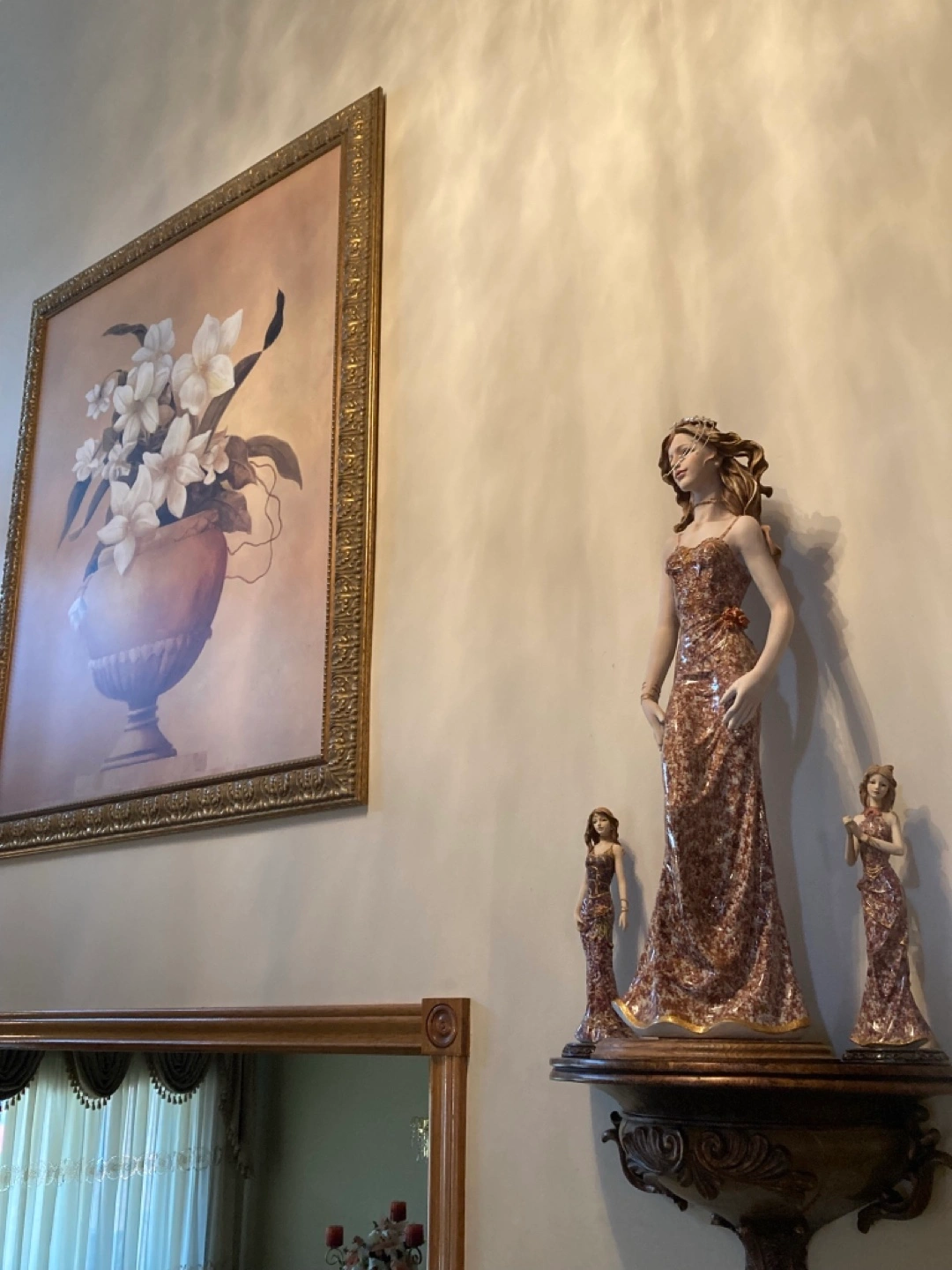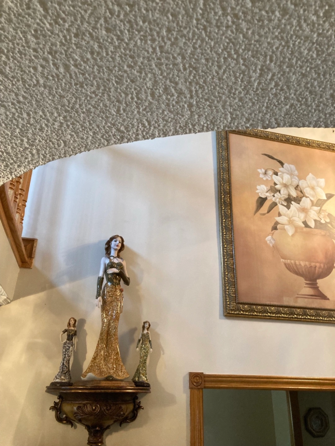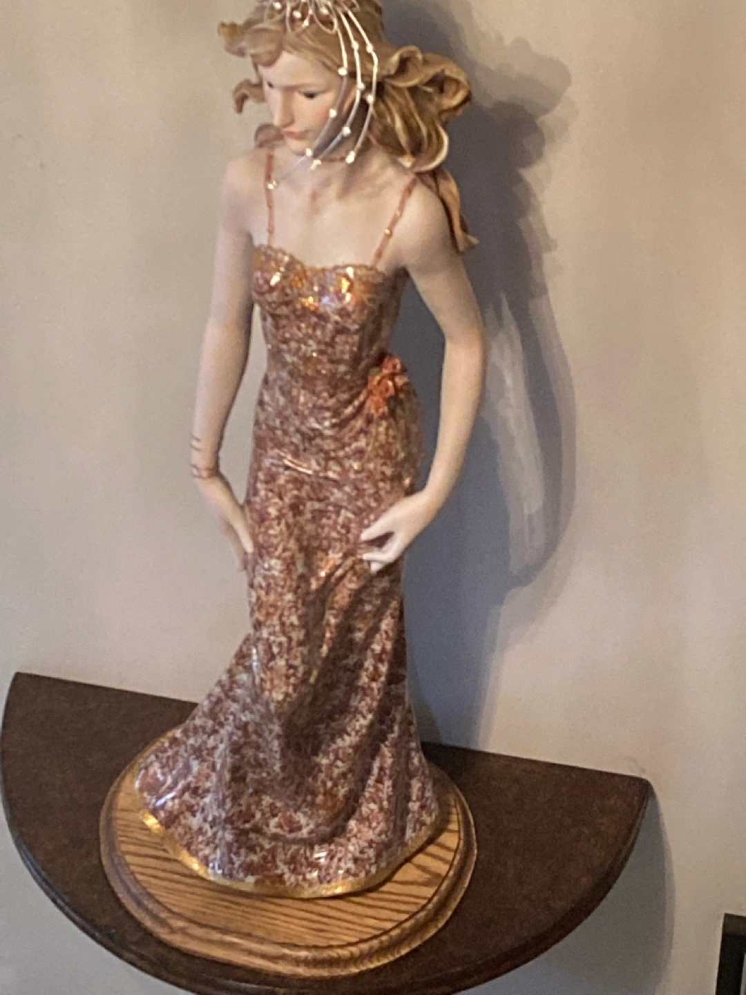 Three lovely porcelain figurines. Large central piece features a woman in a flowing gown. Two smaller matching figurines. Beautiful detail. Perfect for collectors or home décor.