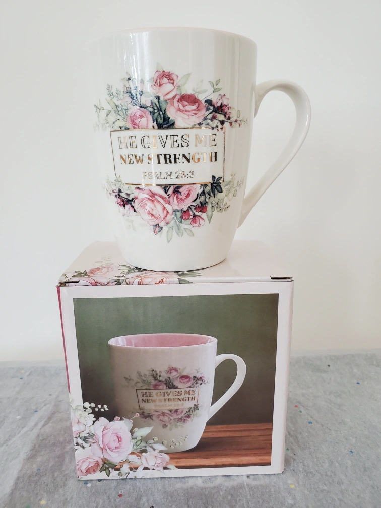 Coffee mug. Features a floral design with pink roses and gold lettering. Quote reads, "He gives me strength." Psalm 23:3 is also included. New in box.