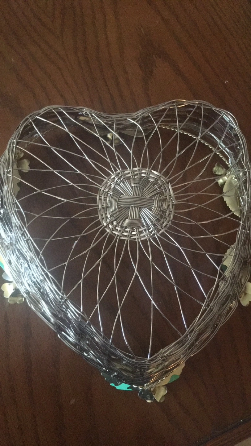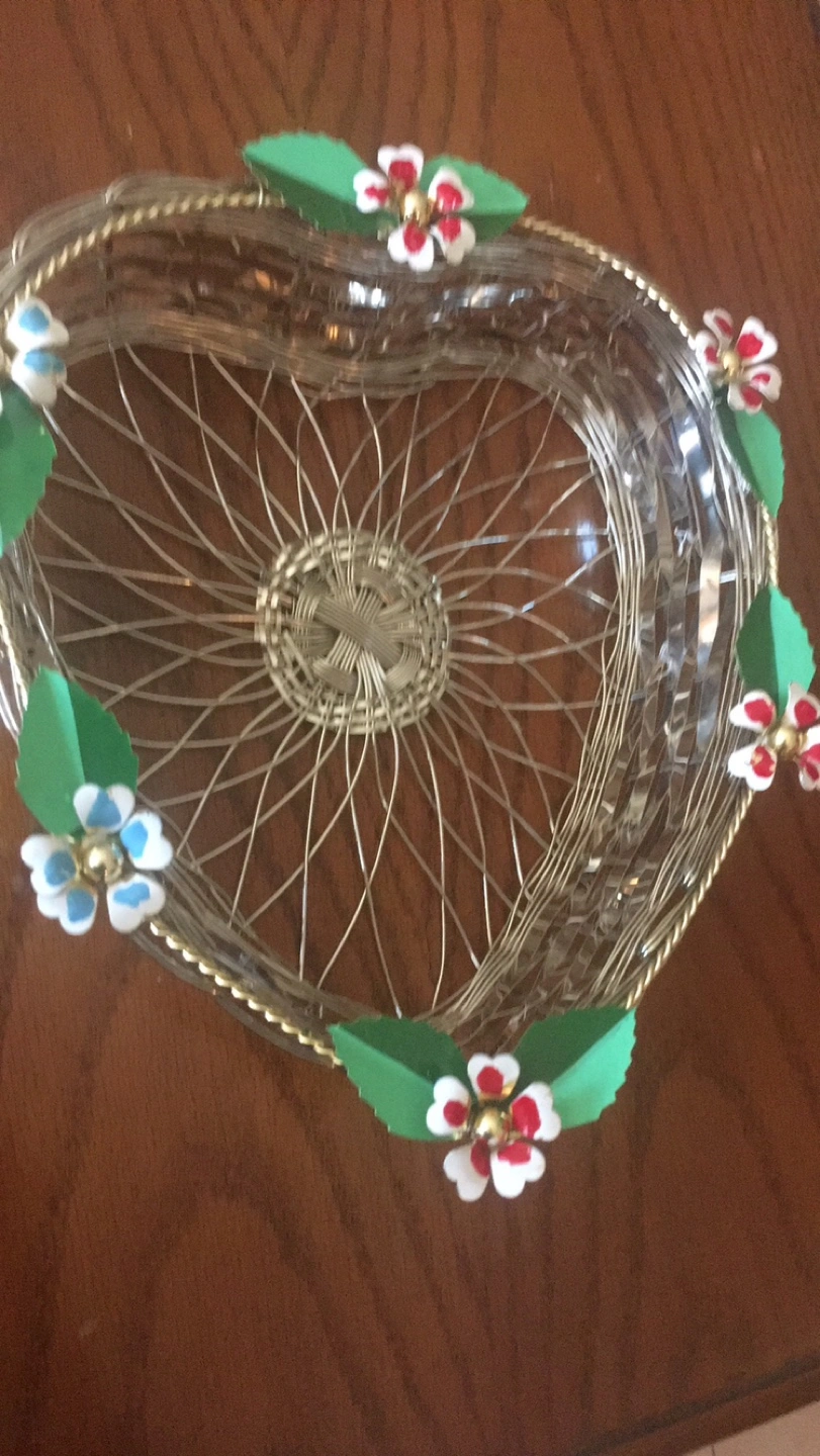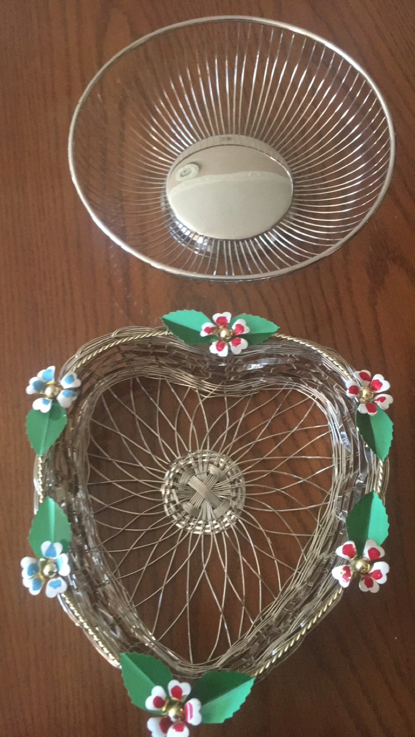 Charming heart-shaped wire basket. Features decorative flowers around the rim. Great for fruit, bread, or decorative purposes. Metal construction.