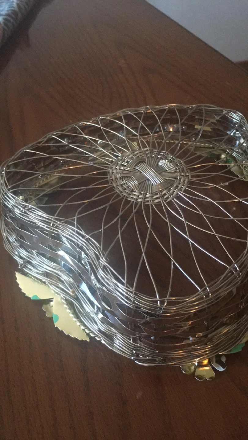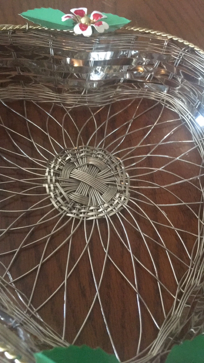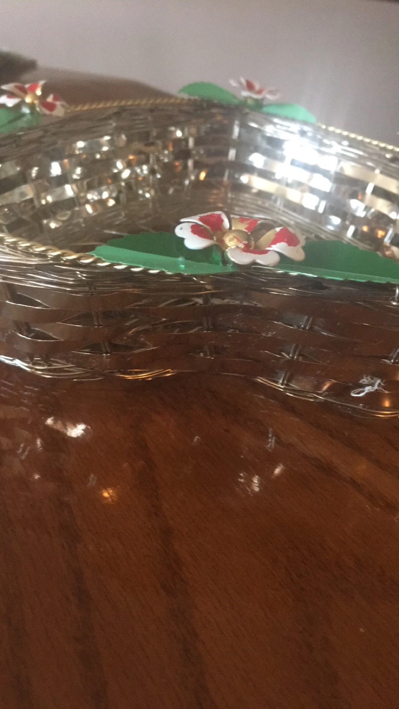 Charming heart-shaped wire basket. Features decorative flowers around the rim. Great for fruit, bread, or decorative purposes. Metal construction.