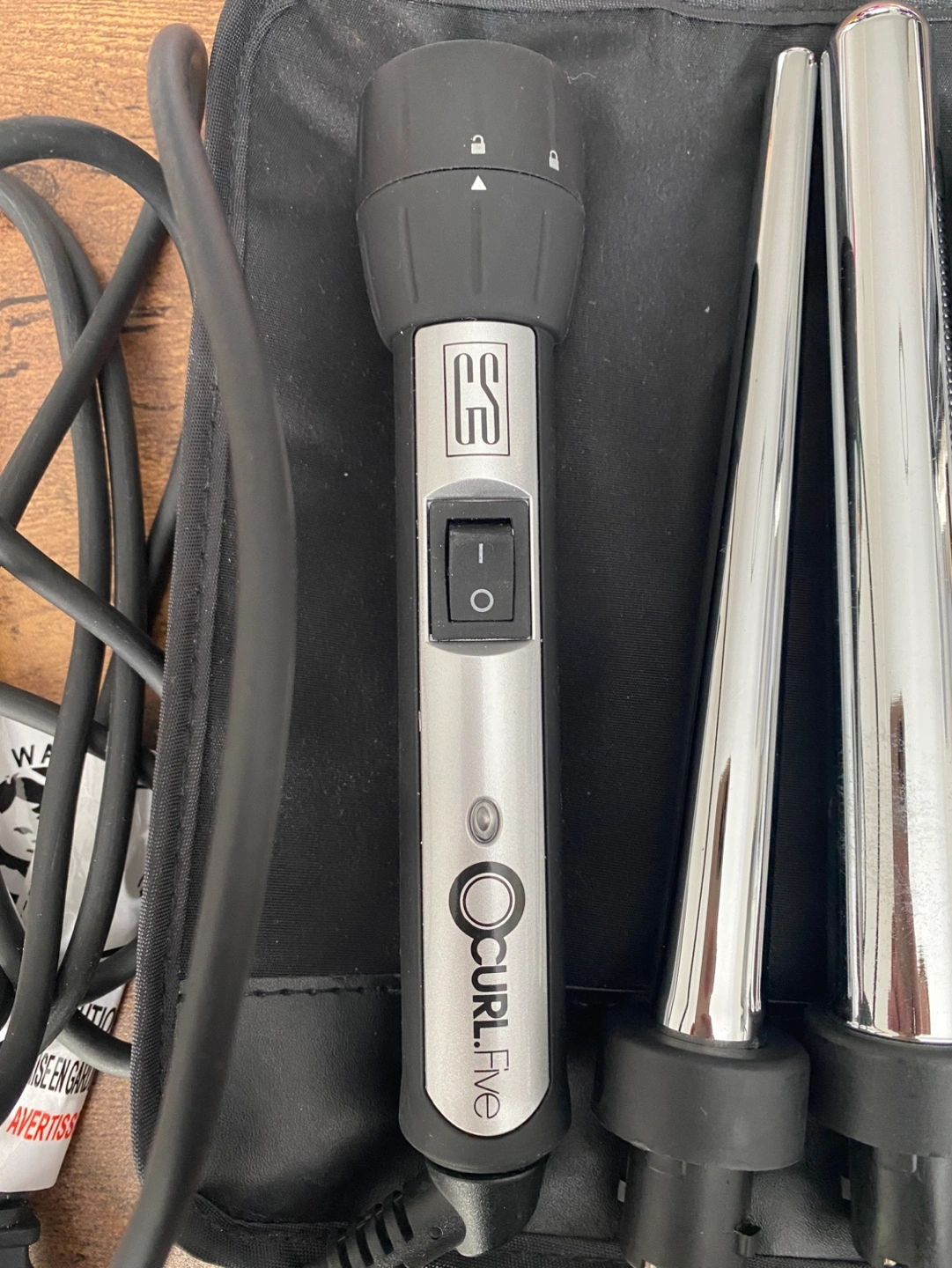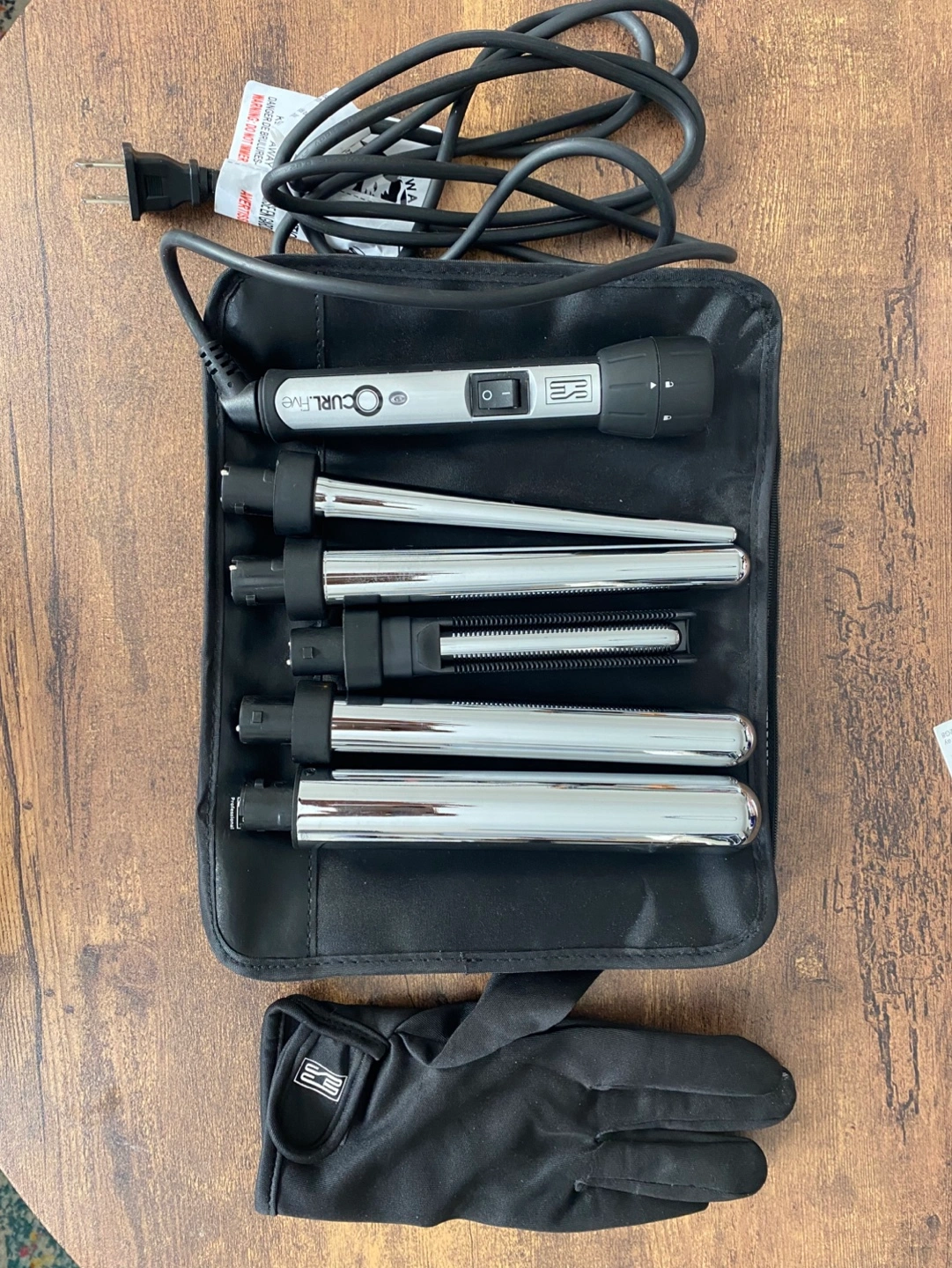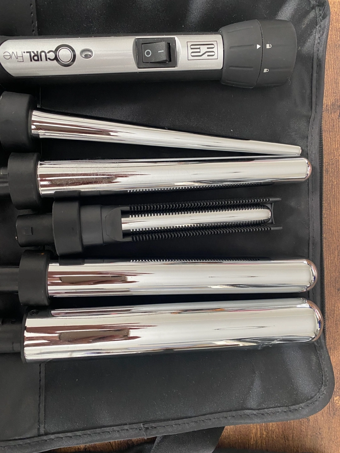 Five interchangeable curling wands. Includes a heat-resistant glove and carrying case.