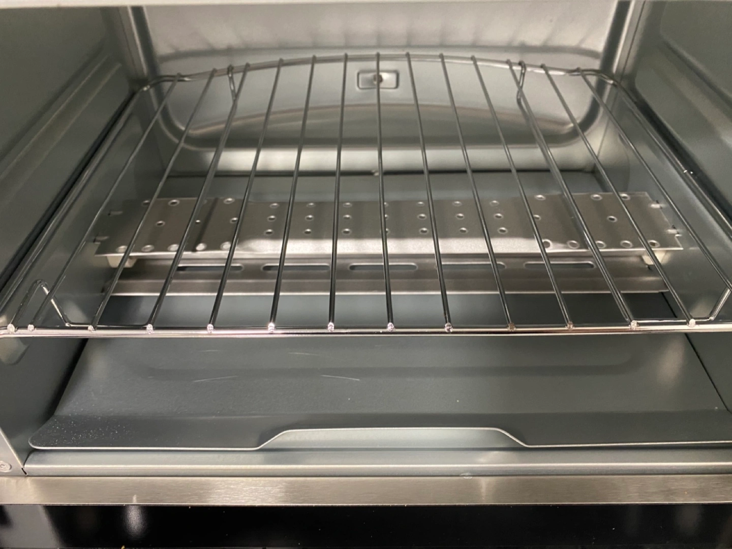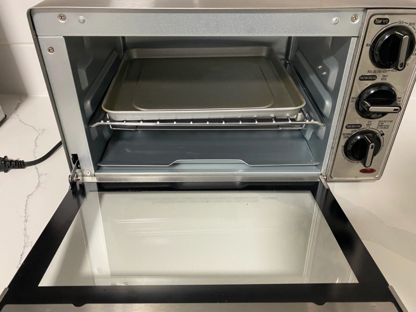 Stainless steel countertop oven. Includes baking pan and wire rack. Multiple functions and temperature settings. Manual included.