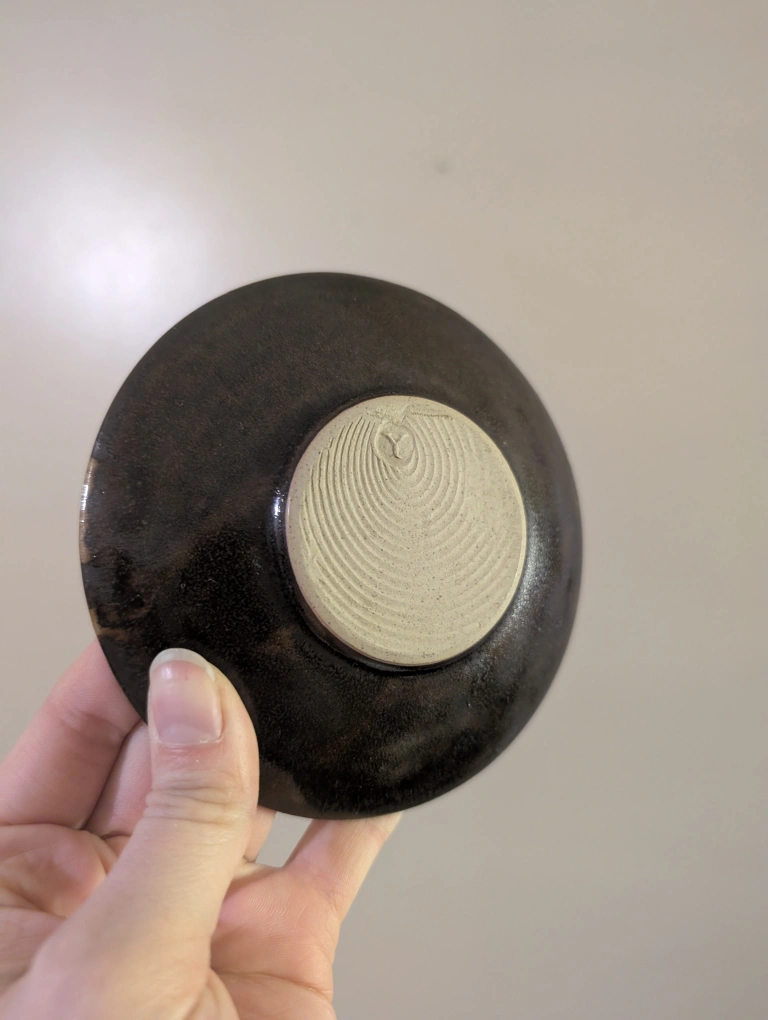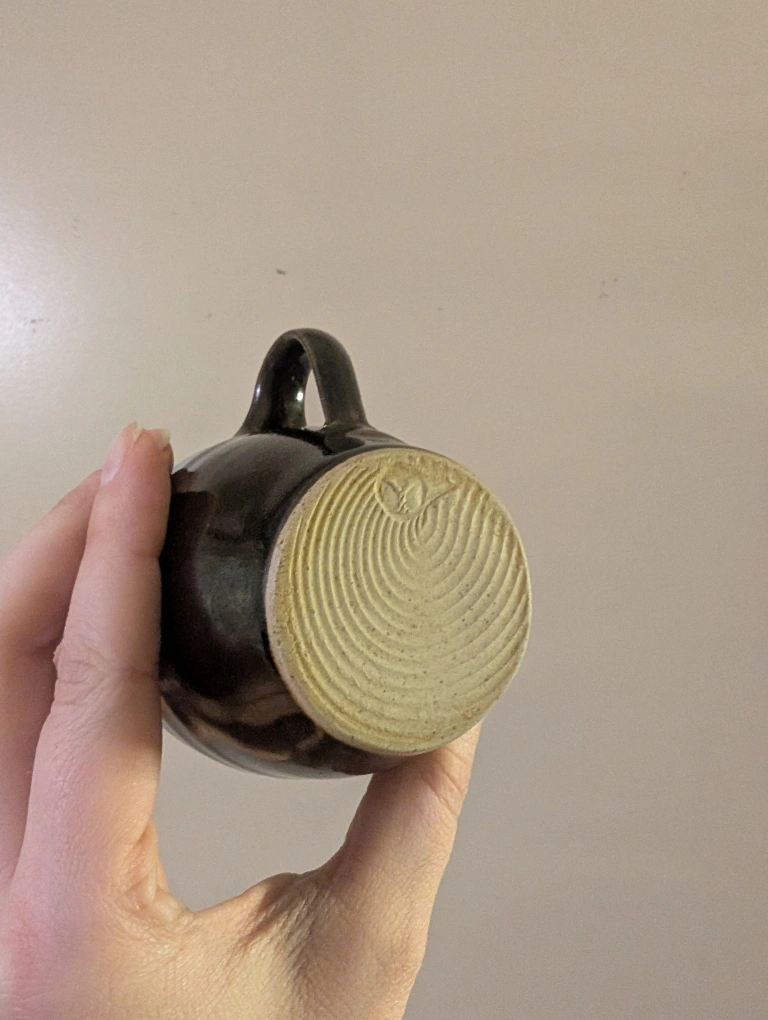 Unique set of handmade pottery mugs and saucers. Dark brown glaze. Each piece features a unique circular mark on the bottom. Excellent condition. Four mugs and four saucers included.
