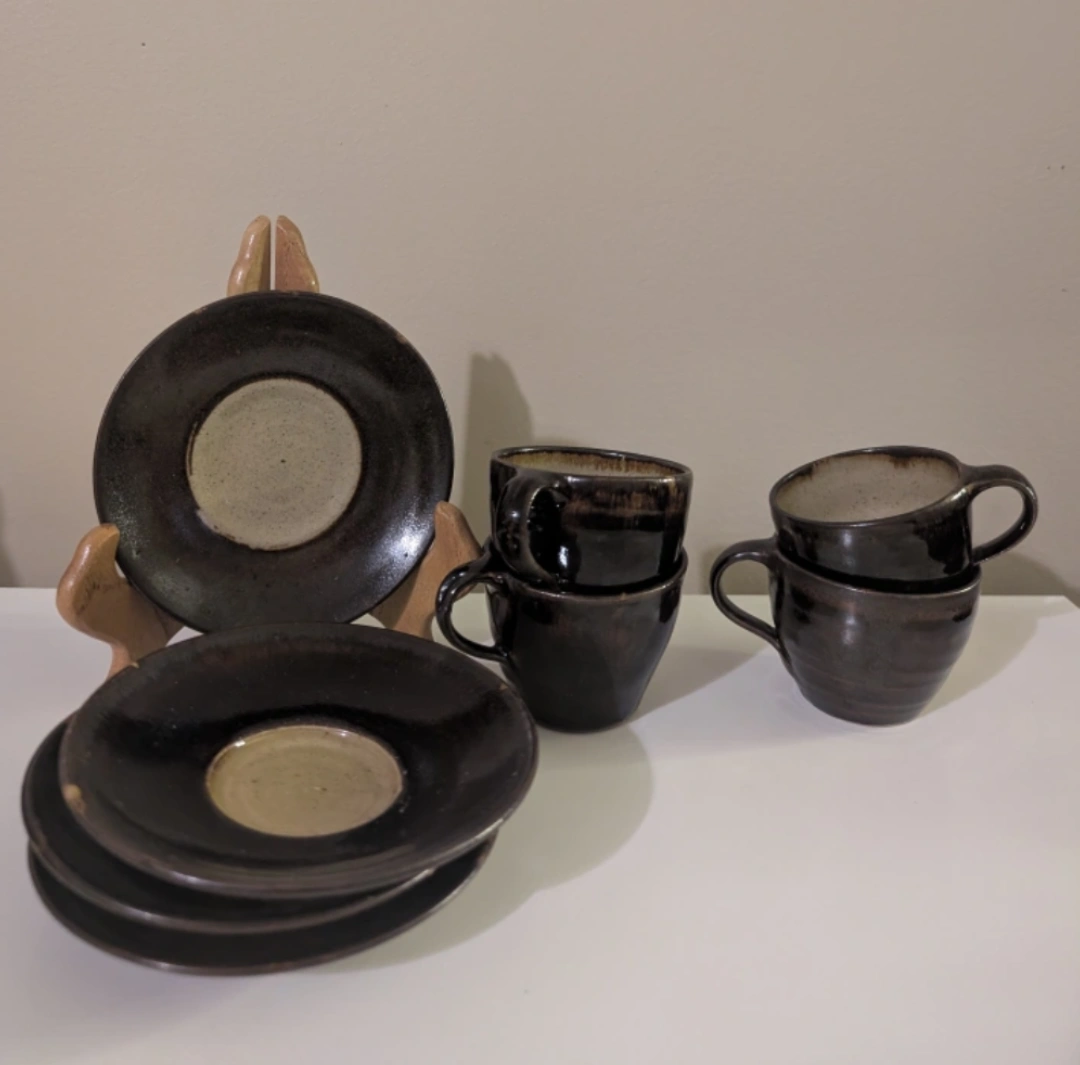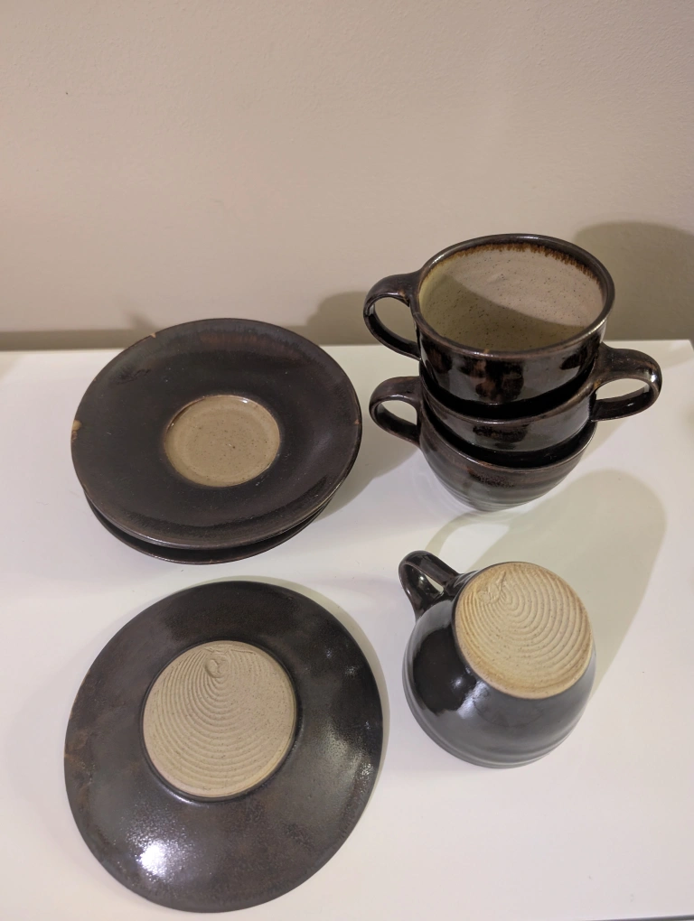 Set of Pottery Mugs and Saucers