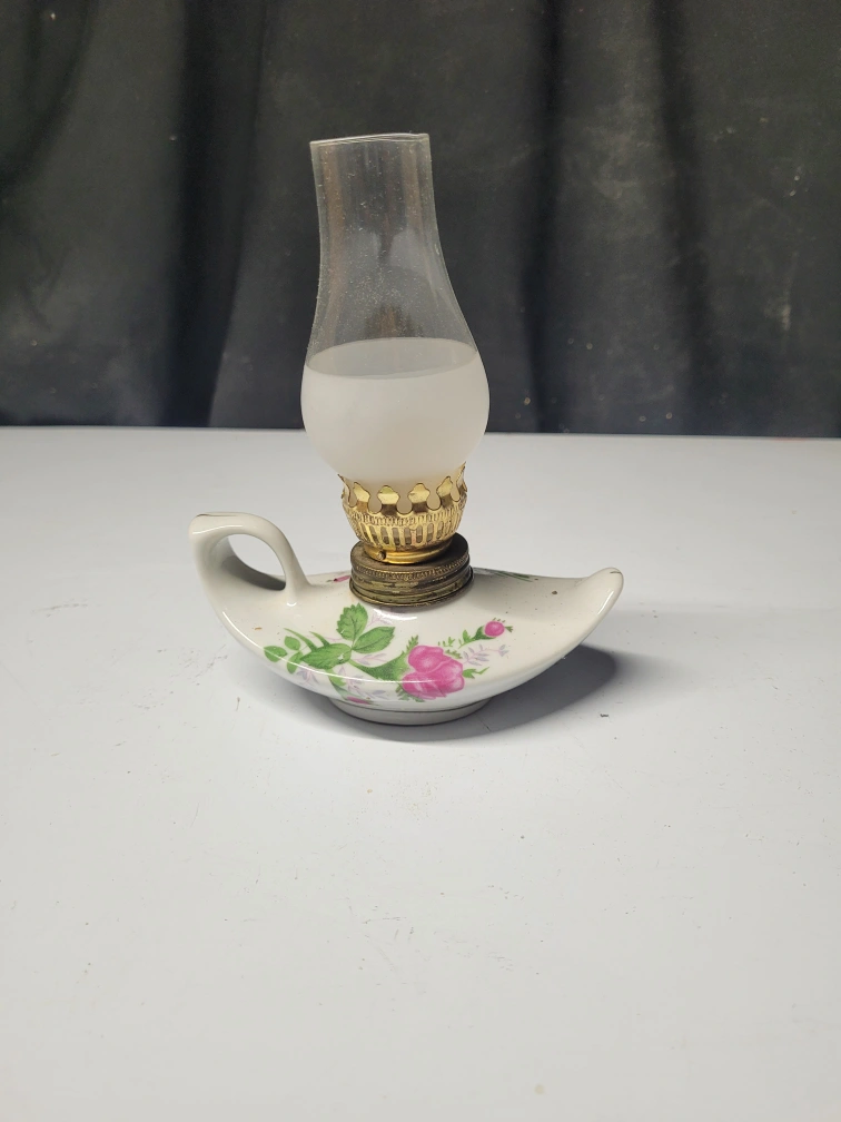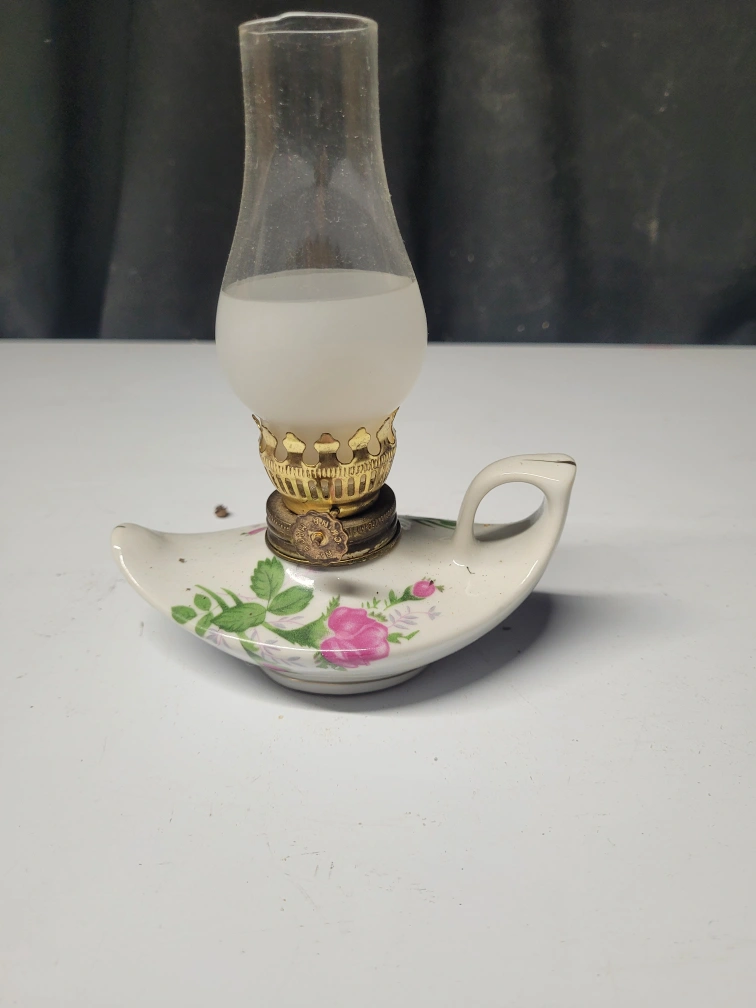 Small decorative oil lamp. Porcelain base with a floral pattern. Glass chimney included. Perfect for a small space or collectible.