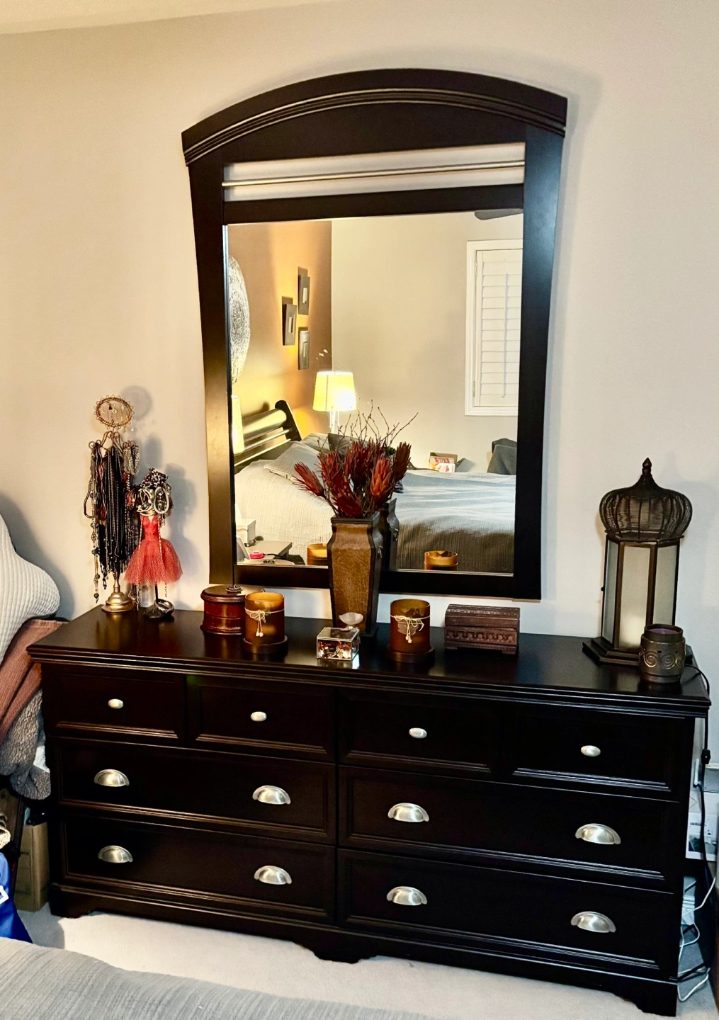 Priced for quick pickup today. 6-drawer dresser, dark brown finish. Matching arched mirror. Silver cup pulls. Great storage.
