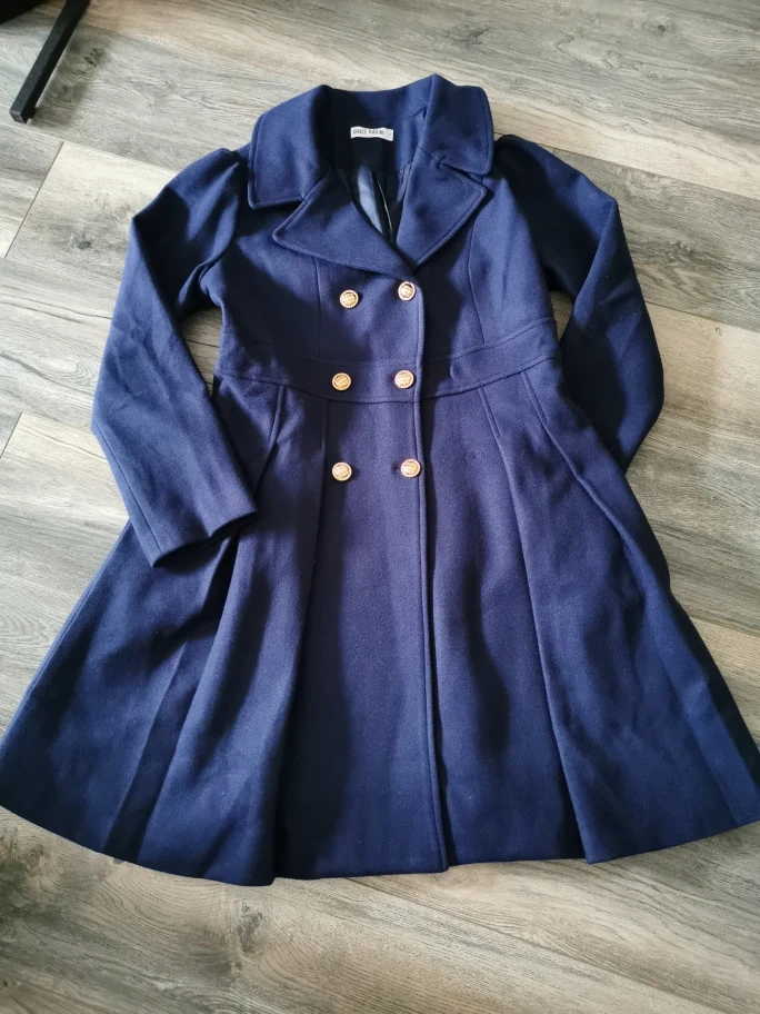 Women's navy blue peacoat. Double-breasted style. Gold buttons. Long sleeves. A-line silhouette. Size medium. 98% polyester, 2% viscose. Care instructions included. The flat size. Shoulder : 15 inc Weist : 18 inc Length (from shoulder) : 37 inc There are both side pockets. NO pet, smoke home You can get discounts if you interrested my items, Get 2 ⇒ $18 3 ⇒ $26 4 ⇒ $34 5 ⇒ $40 (one for free :)