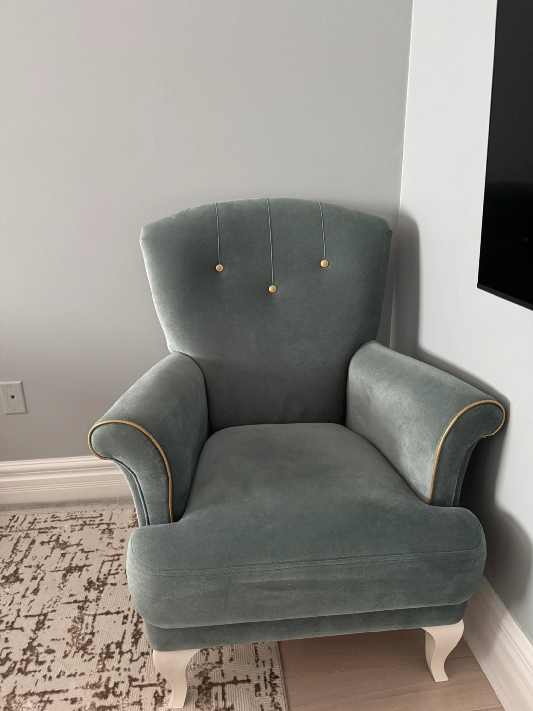 Beautiful teal velvet armchair. Gold detailing on arms and buttons. White legs. Perfect for adding a touch of elegance to your living space. Two of them