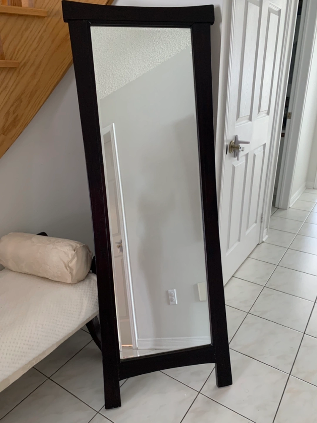 Full-length mirror with a dark brown frame. Free-standing design. Perfect for any room. 63” X 23.5”